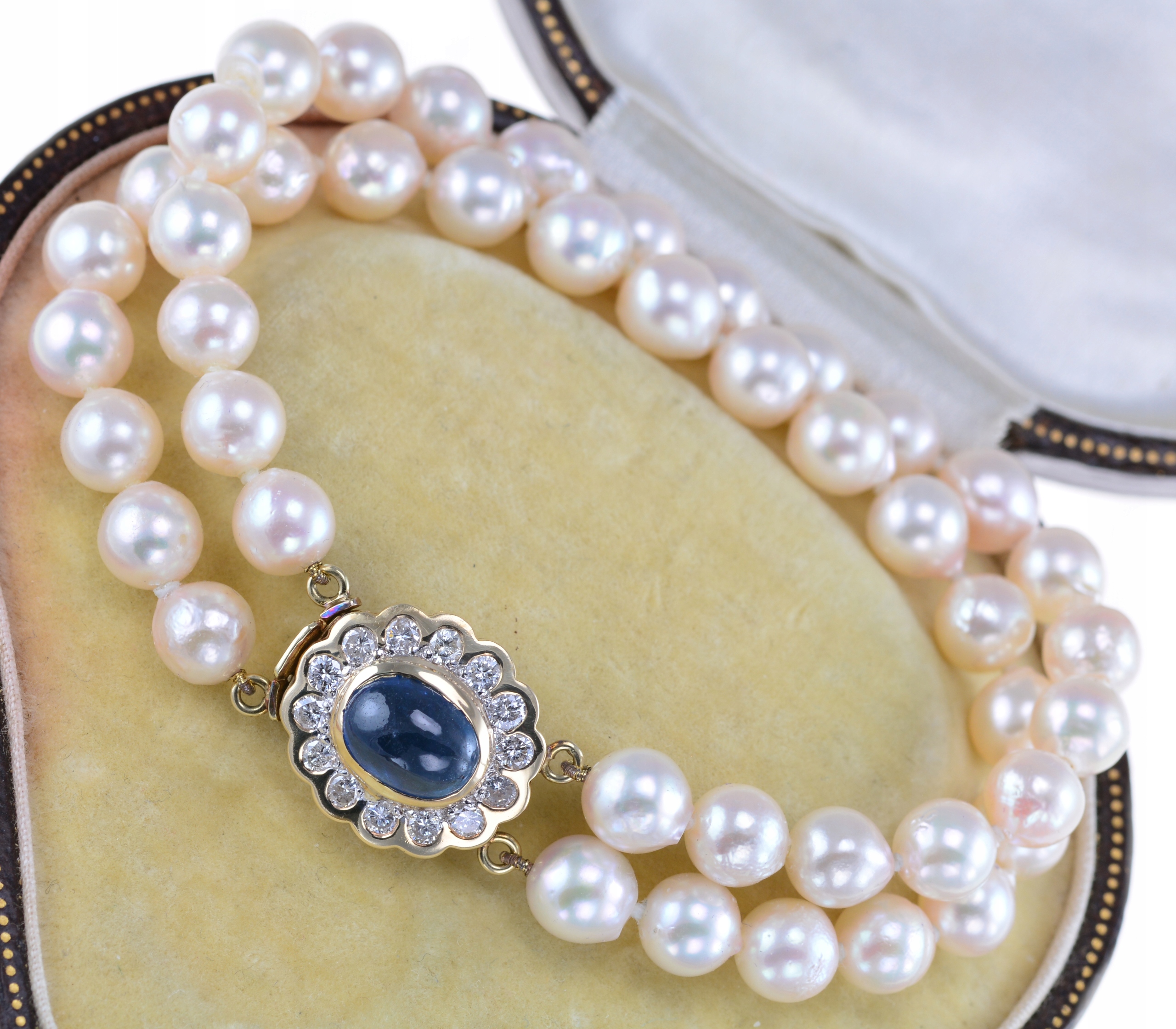 Предмет продажи - браслет из культивированного пресноводного жемчуга с диаметром около 8 мм каждый. Два ряда жемчуга увенчаны впечатляющей застежкой из 14-каратного золота. Застежка с синим сапфиром в форме кабошона общим весом около 3,2 карата и бриллиантами общим весом 0,78 карата и параметрами: чистота P, цвет GH. Размер застежки 18 х 17 мм.