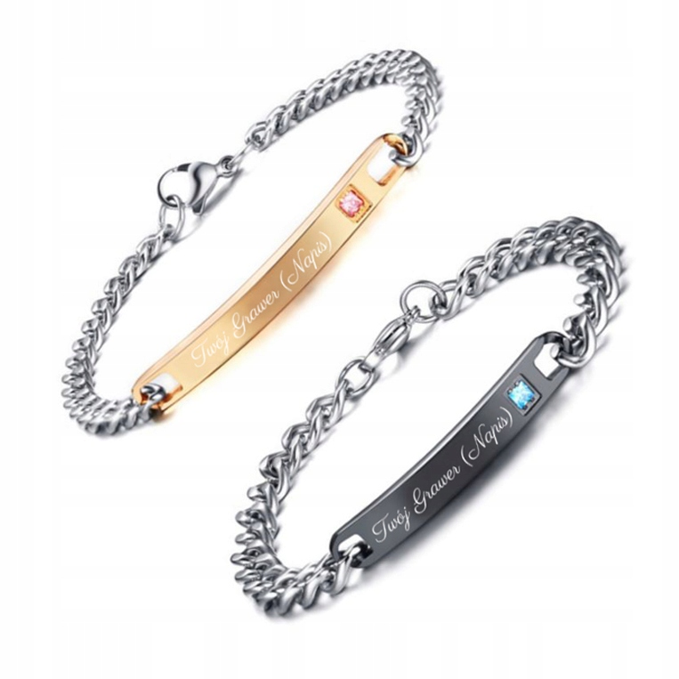 Отделка: блестящая серебряный цвет, золотой и черный цвета, покрыты прочным методом IP. Место для гравировки на браслетах.