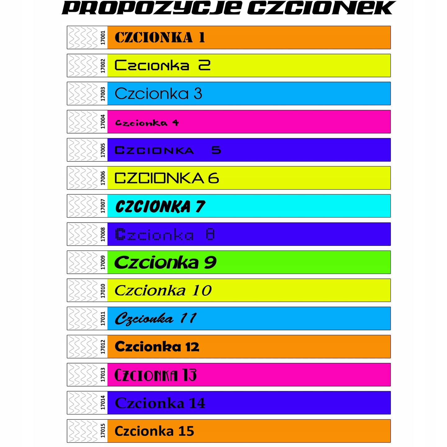 В приведенных ниже шаблонах, пожалуйста, выберите заинтересованный в себе шрифт. В сообщении для продавца напишите номер шрифта, цвет полос и содержание печати, которое будет размещено на полосах + любой логотип, пожалуйста, отправьте на нашу электронную почту.