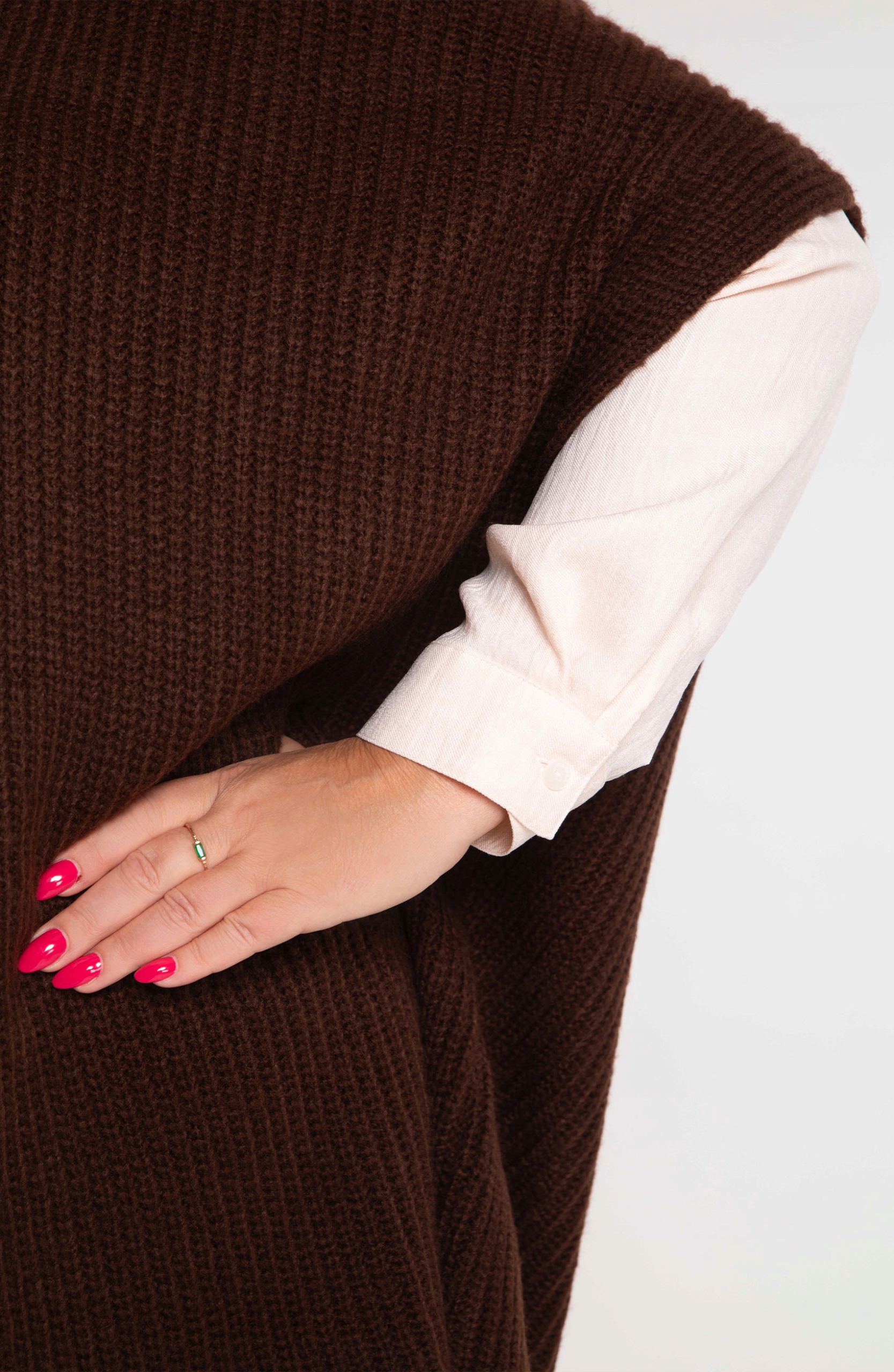 Пончо находится в одном, универсальном размере, но из -за его свободного разреза он будет подходить для женщин в размерах от 50 до 60 .
