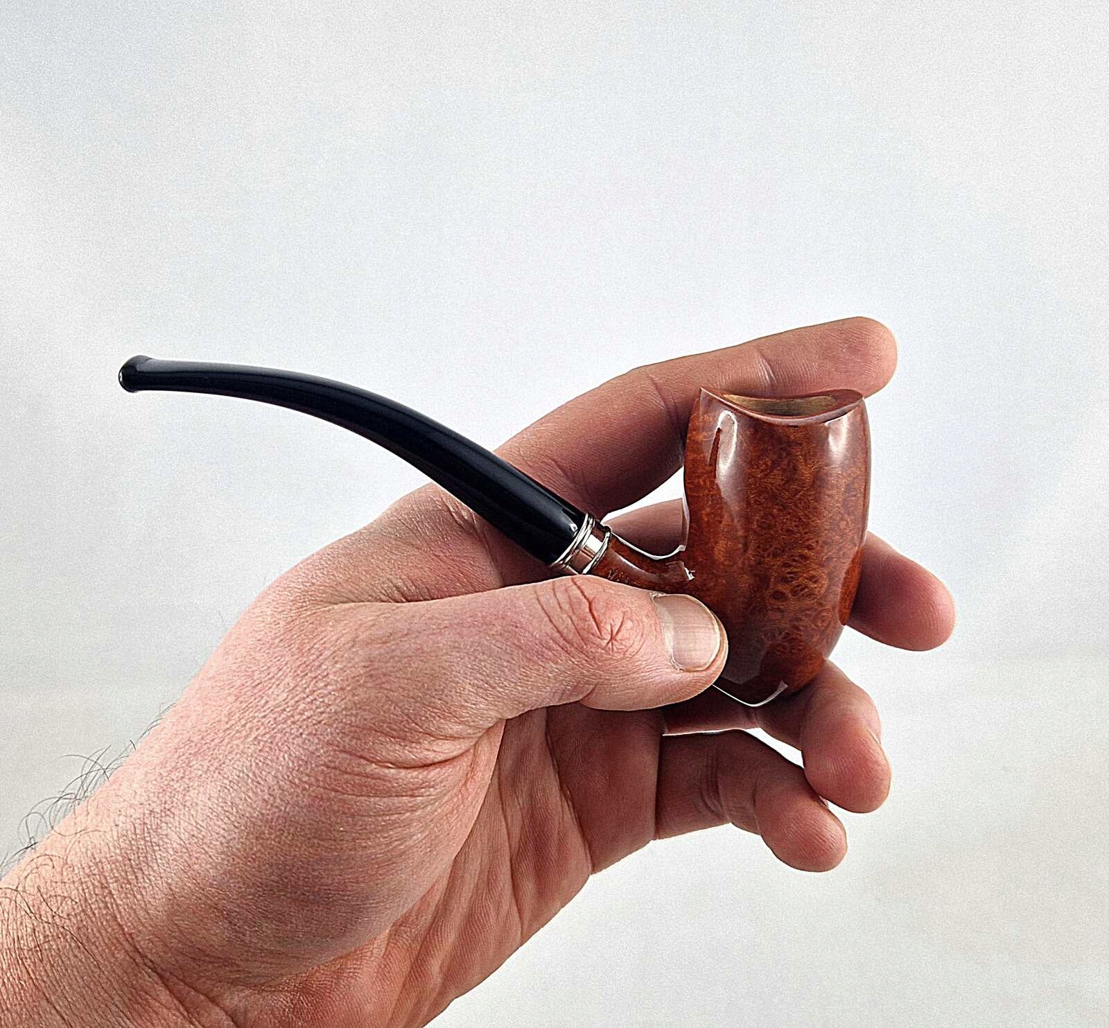 Красивая трубка ручной работы из высококачественного бриара от всемирно известного бренда Brebbia. Необычная высокая голова с волнистым ободком, светлая тиковая окраска, прекрасно подчеркивает богатую текстуру бриара. Глубокий очаг не был покрыт предкарбонатом и имеет естественный цвет бриара. Как и любая новая трубка, она требует правильного загара. Короткая шейка заканчивается декоративным кольцом, которое соответствует логотипу MPB (Manufactured Pipe Brebbia) на акриловом мундштуке. Трубка изготовлена с большой точностью и вниманием к деталям, упакована в чехол и коробку производителя.