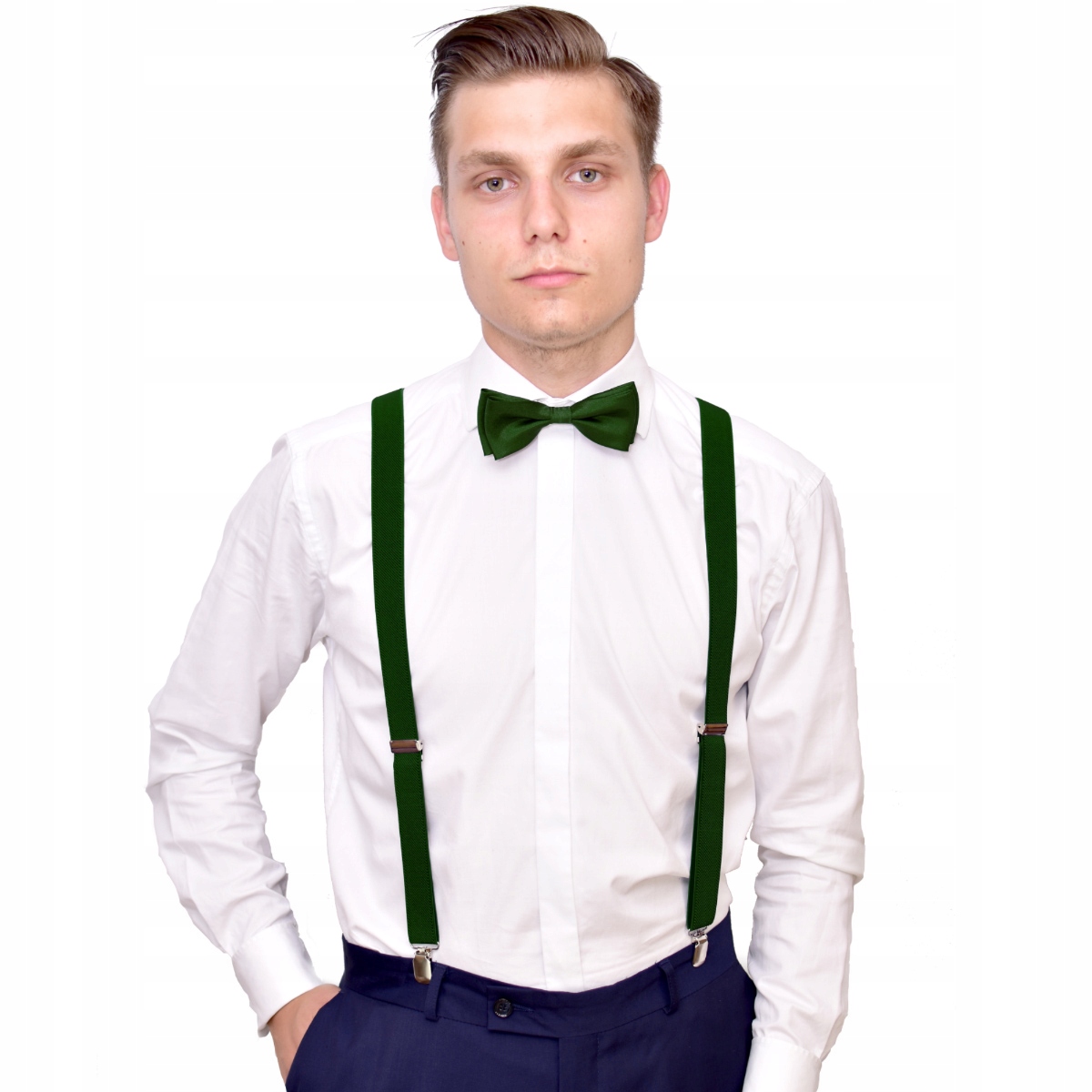 Галстук-бабочка и подтяжки в тон.