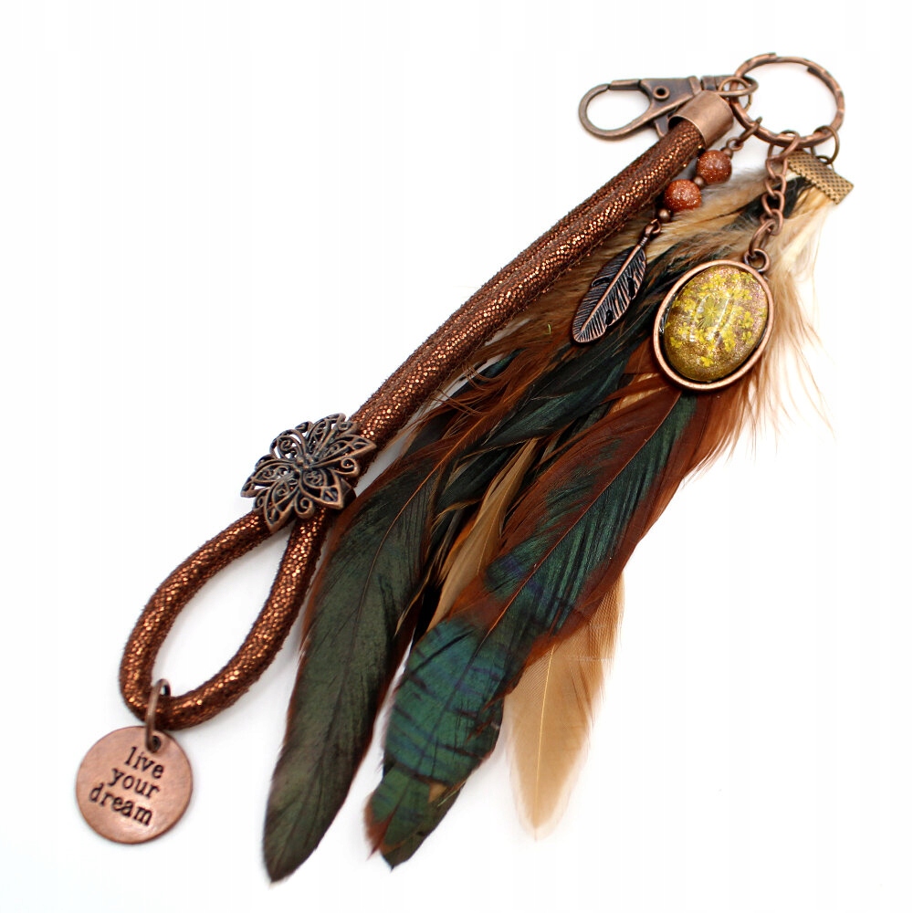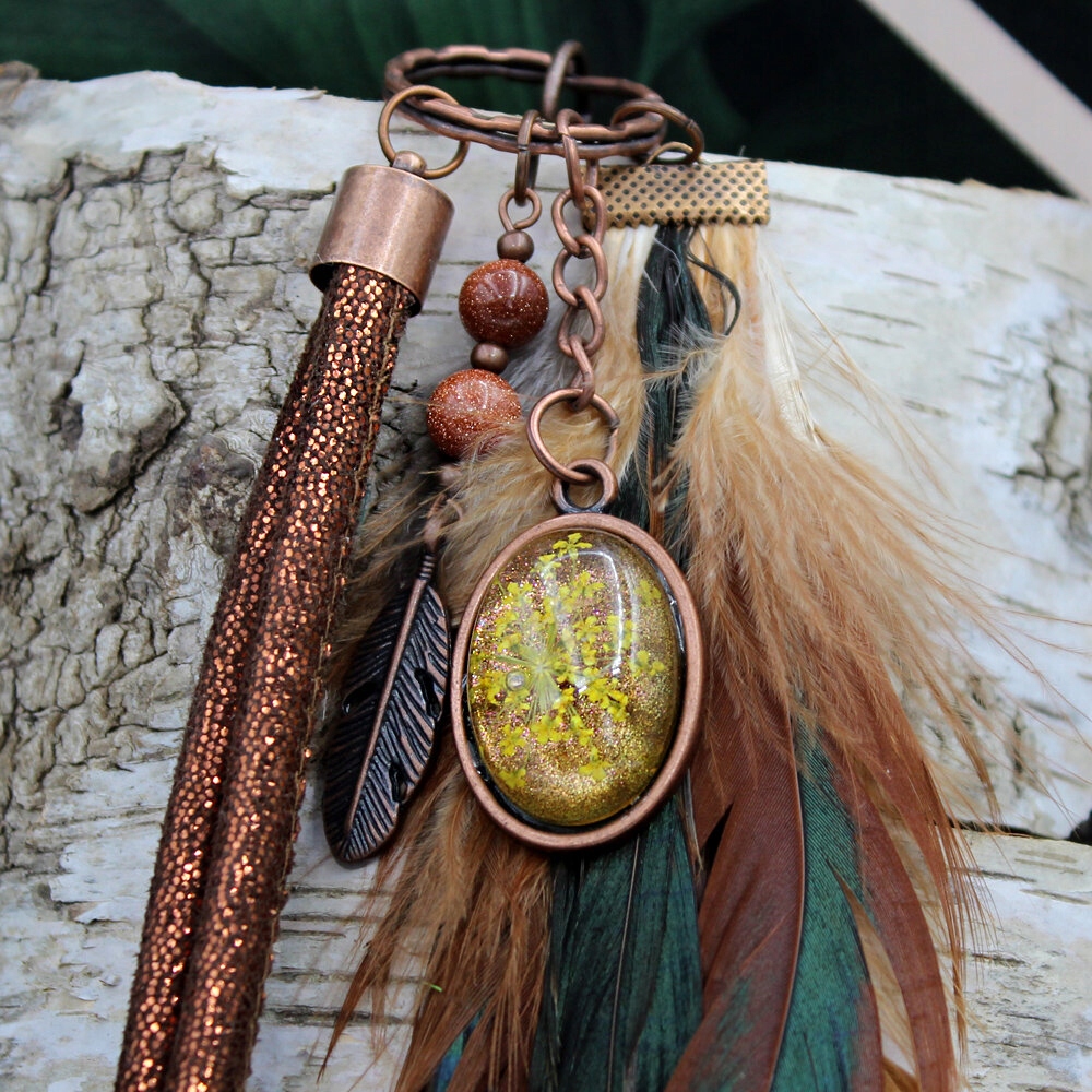 Брелок или сумочка с подвесками - настоящий, засушенный цветок, погруженный в смолу, экоремешок, перья и каменные шарики - песок пустыни.
