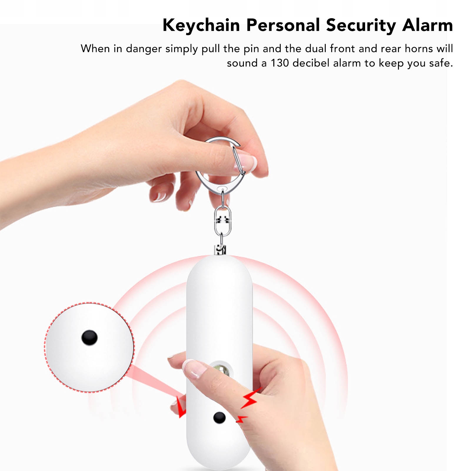 Брелок-сигнализация личной безопасности, высокий децибел, двойной звуковой сигнал, водонепроницаемый портативный светодиодный стробоскоп для женщин и детей, белый