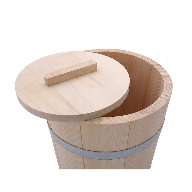 капуста и огурцы с емкостью 15 литров, сделанные из дерева. Продукт содержит стальные полосы нержавеющей стали, которые обеспечивают ее стеснение. Крышка соответствует таким образом, что позволяет естественному маринованию продуктов дома. Натуральная пихта позволяет даже созревать капусту и огурцы, что приводит к глубокому вкусу маринованных овощей. Крышка защищает содержание от воздуха, пыли, насекомых и доступа к солнцу.