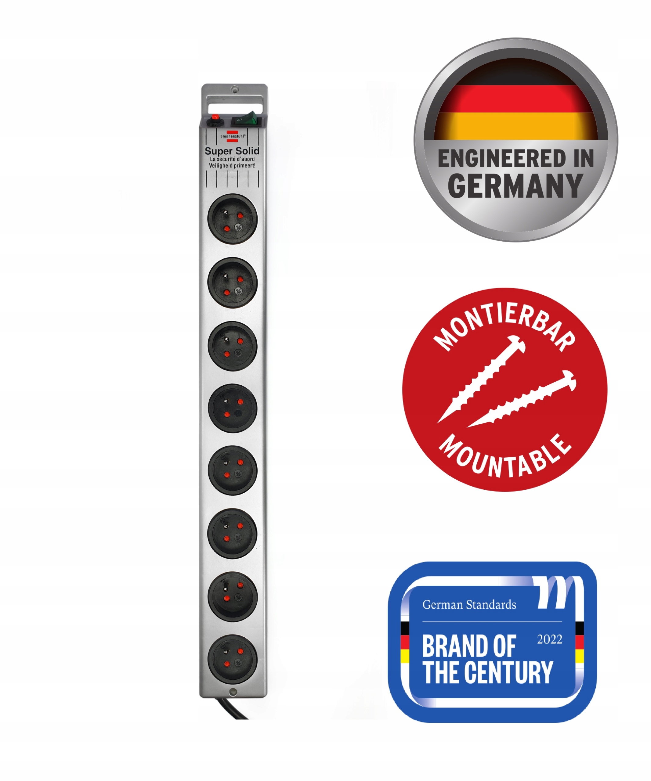 Brennenstuhl Super-Solid — это высококачественный удлинитель с 8 розетками и очень длинным кабелем 2,5 м (H05VV- F 3G1 ,5), автоматический выключатель на ток 16 А и повышенной защитой контактов. Удлинитель имеет выключатель с подсветкой из ударопрочного поликарбоната.
