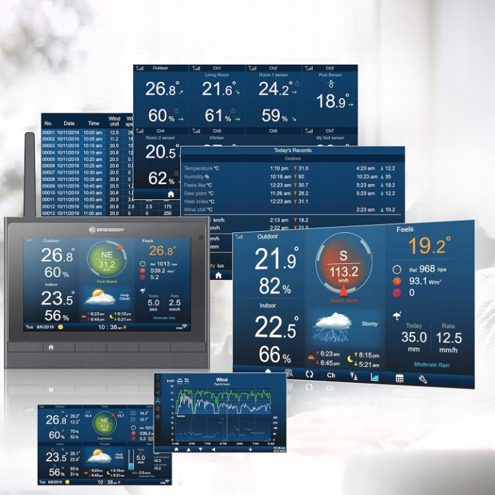 Что делает погода? Используя метеокамп Bresser Meteocamp HD 7 в 1, вы решаете, как должен выглядеть ответ на этот вопрос. Динамический цветовой дисплей HD-TFT с диагоналем 17,8 см обеспечивает измерение данных обоих датчиков в различных режимах отображения. С одной кнопкой вы получите необходимые представления о погоде: главной экрана с основными данными и надежным прогнозом погоды, подробный дисплей с еще большей информацией, в установке самых высоких значений и тенденций или обзора температуры и давления воздуха. Однако, поскольку это не только в тот момент, который имеет значение, восхитительные погодные лягушки-это то, что метеостанция Wi-Fi извлекает с полного уровня исторических данных. Протокол данных предоставляет с помощью Avid Meteorologs подробно измерение данных с 5, 10 или 30 минутами - готовые к экспорту USB и дальнейшим анализом на компьютере. День они появляются на поверхности изображения на метеостанции Wi-Fi. И благодаря исторической графике буквально кривая с точки зрения погоды