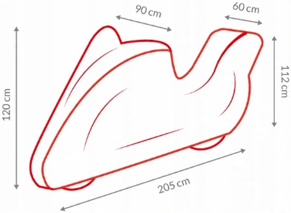 - Размер «S», длина 205 см, высота спереди 120 см, ширина руля 90 см, ширина сзади 60 см, высота сзади 112 см.