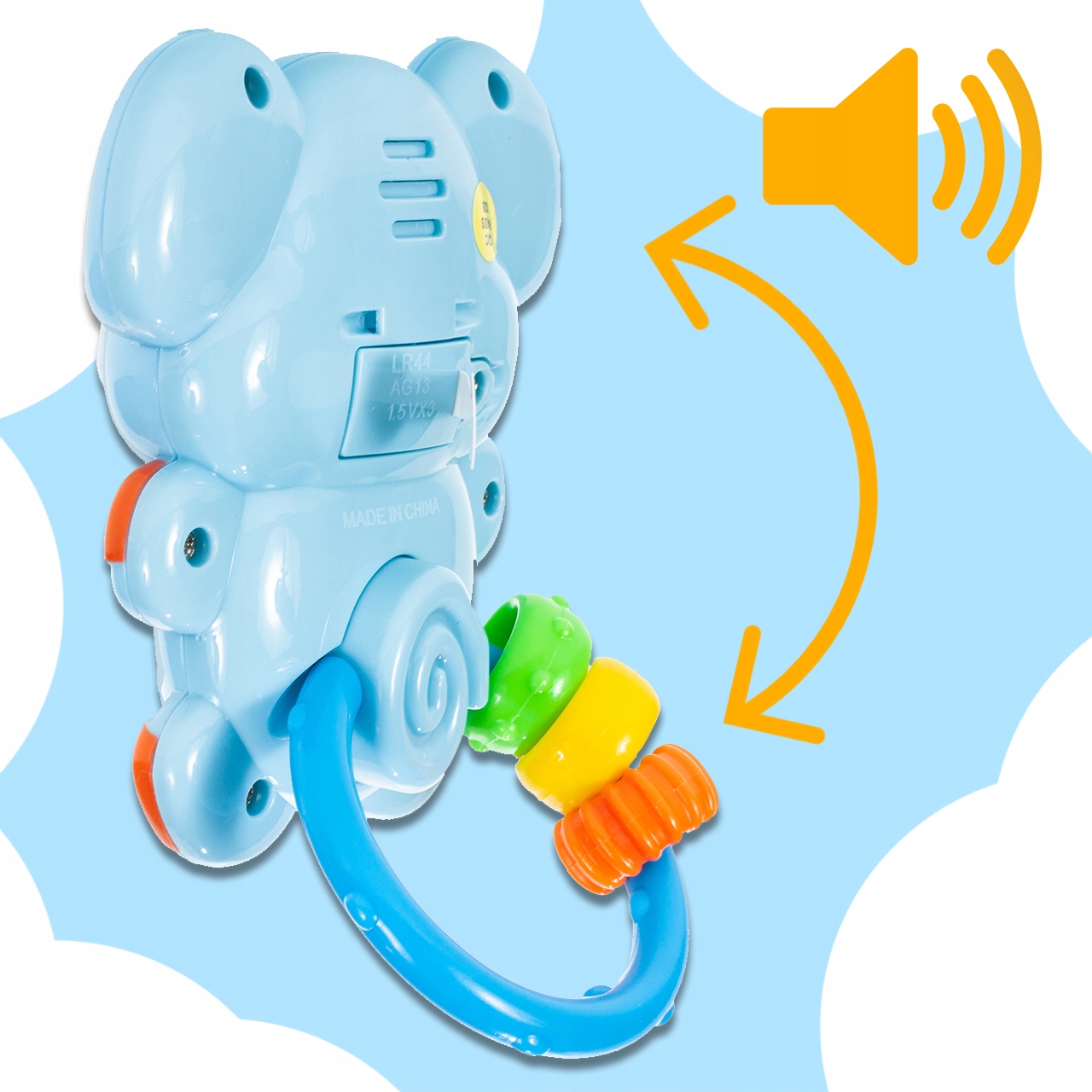 Интерактивная детская погремушка в виде Слона. После перемещения колеса животное издает различные звуки, начинает проигрывать одну из нескольких мелодий, слышен детский смех и начинает мигать красный огонек. В брюшке есть шарики, которые движутся, когда вы двигаете погремушку, а на кольце есть движущиеся колеса поменьше.