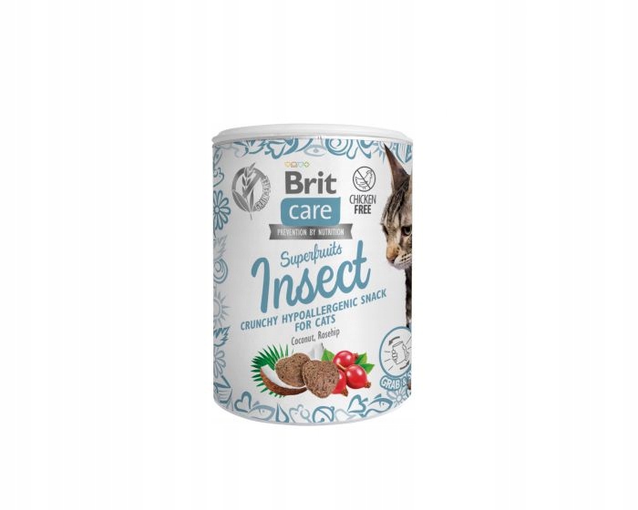 Brit Care Cat Snack Superfruits & Insect приготовлен из насекомых, которые практически не обладают аллергенным потенциалом. Лакомства в форме сердечек дополнены растительными ингредиентами, такими как кокос и шиповник. Это беззерновые закуски, которые поставляются в практичной банке с крышкой.