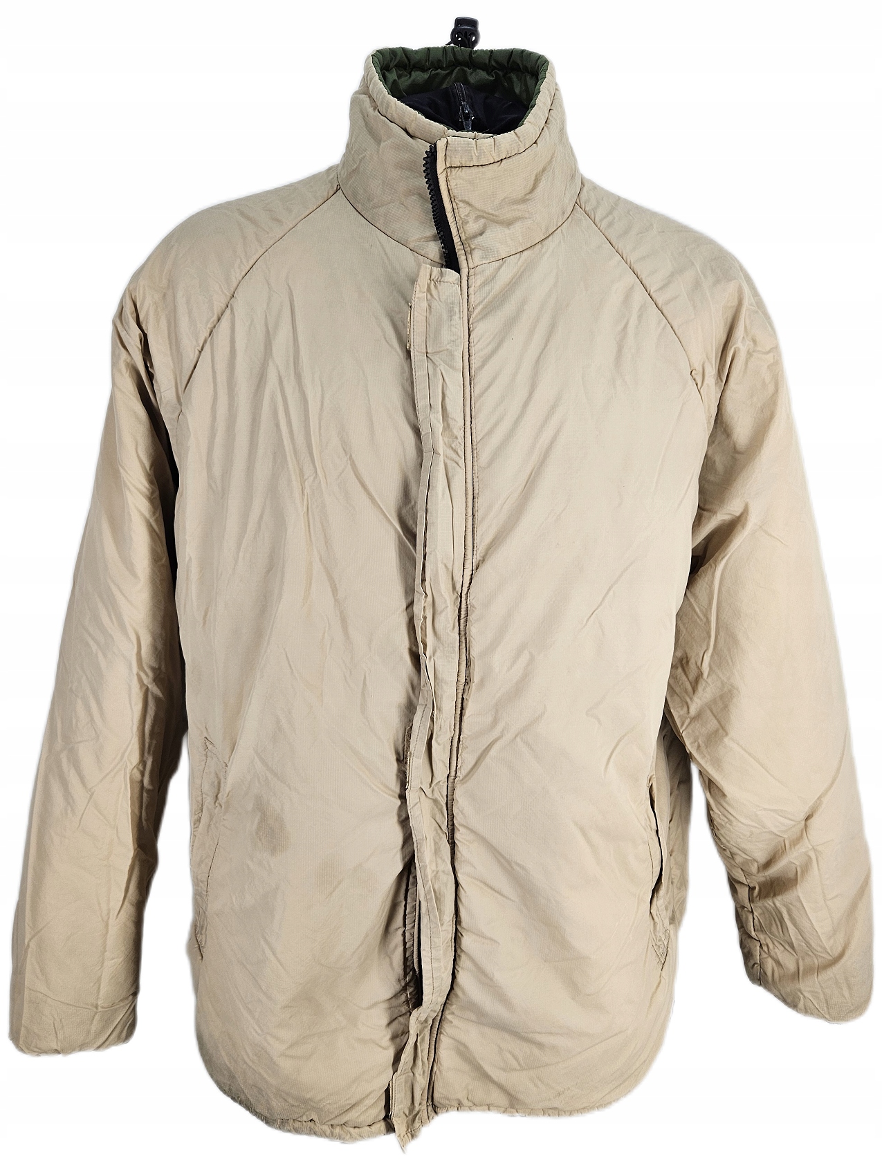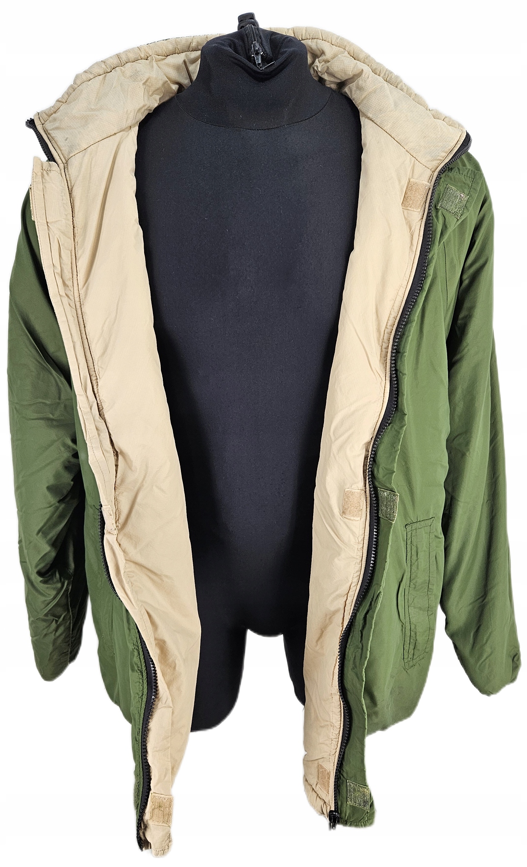 Куртка изготовлена из высококачественных материалов, состоящих из 100% нейлона для внешнего слоя и 100% полиэстера для внешнего слоя, внутреннего. Он очень теплый и застегивается на молнию. Завязки внизу и воротник защищают от холода. Манжеты отделаны резинкой по размеру запястий. Двусторонняя куртка оливкового и пустынного цветов. Имеет два кармана на молнии на уровне бедер.
