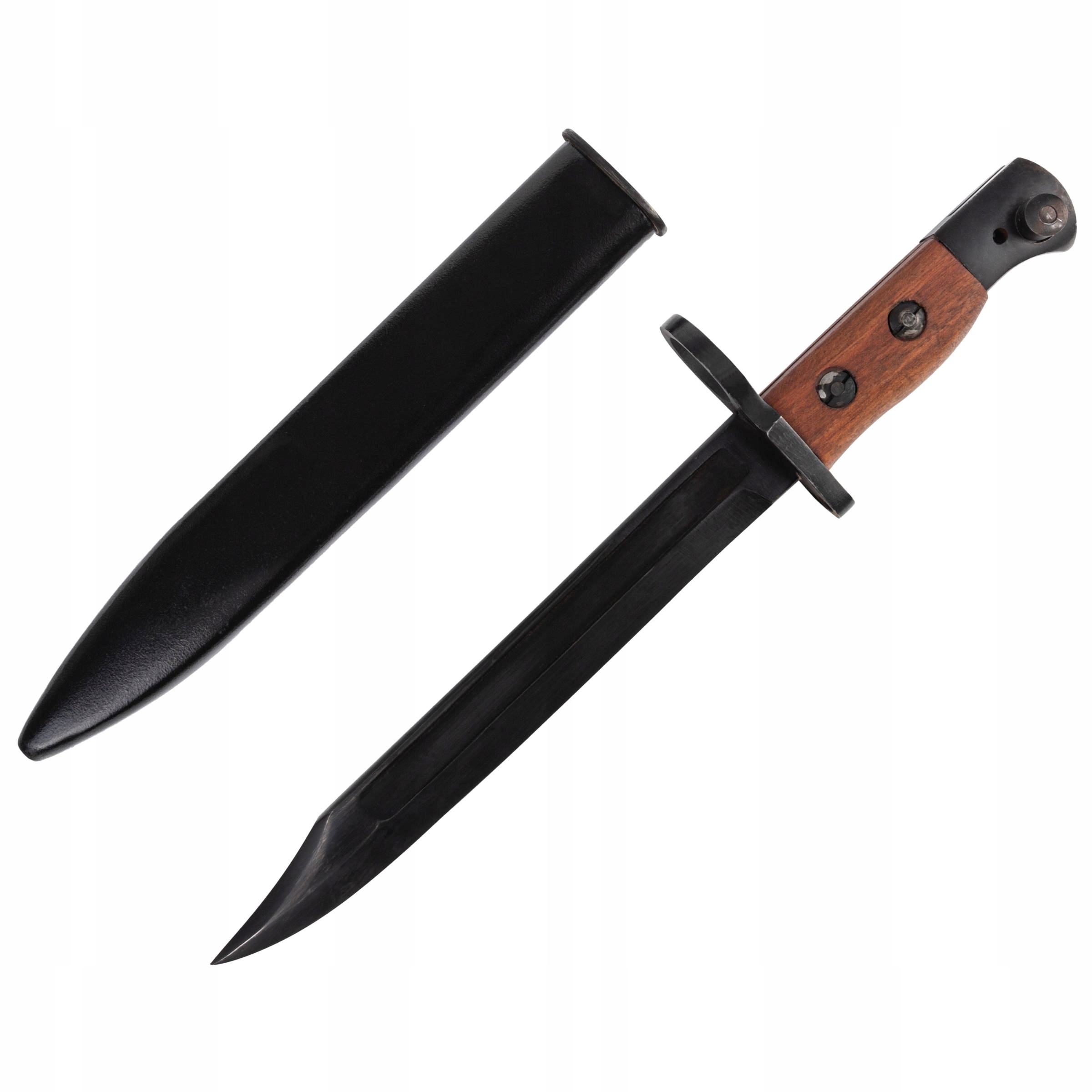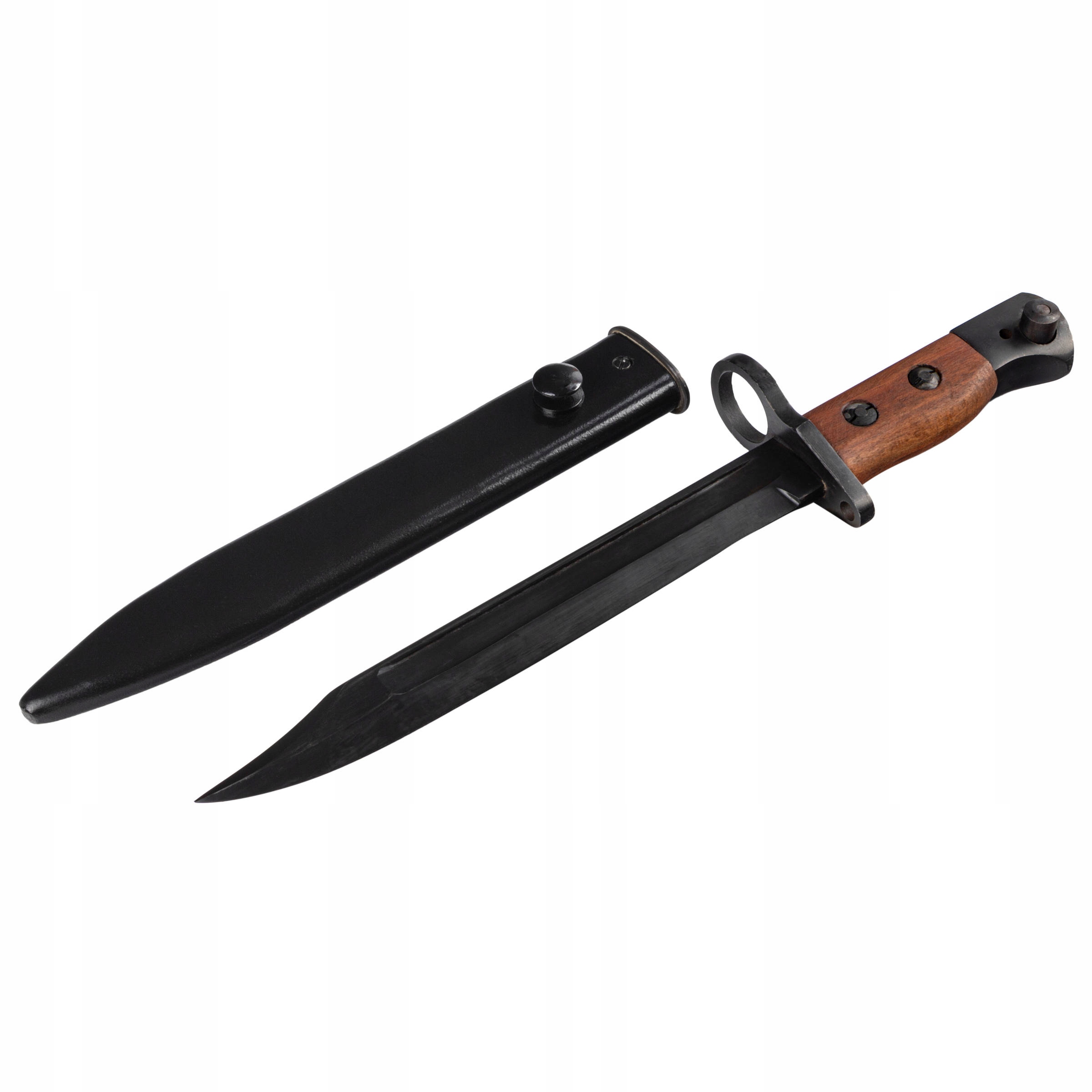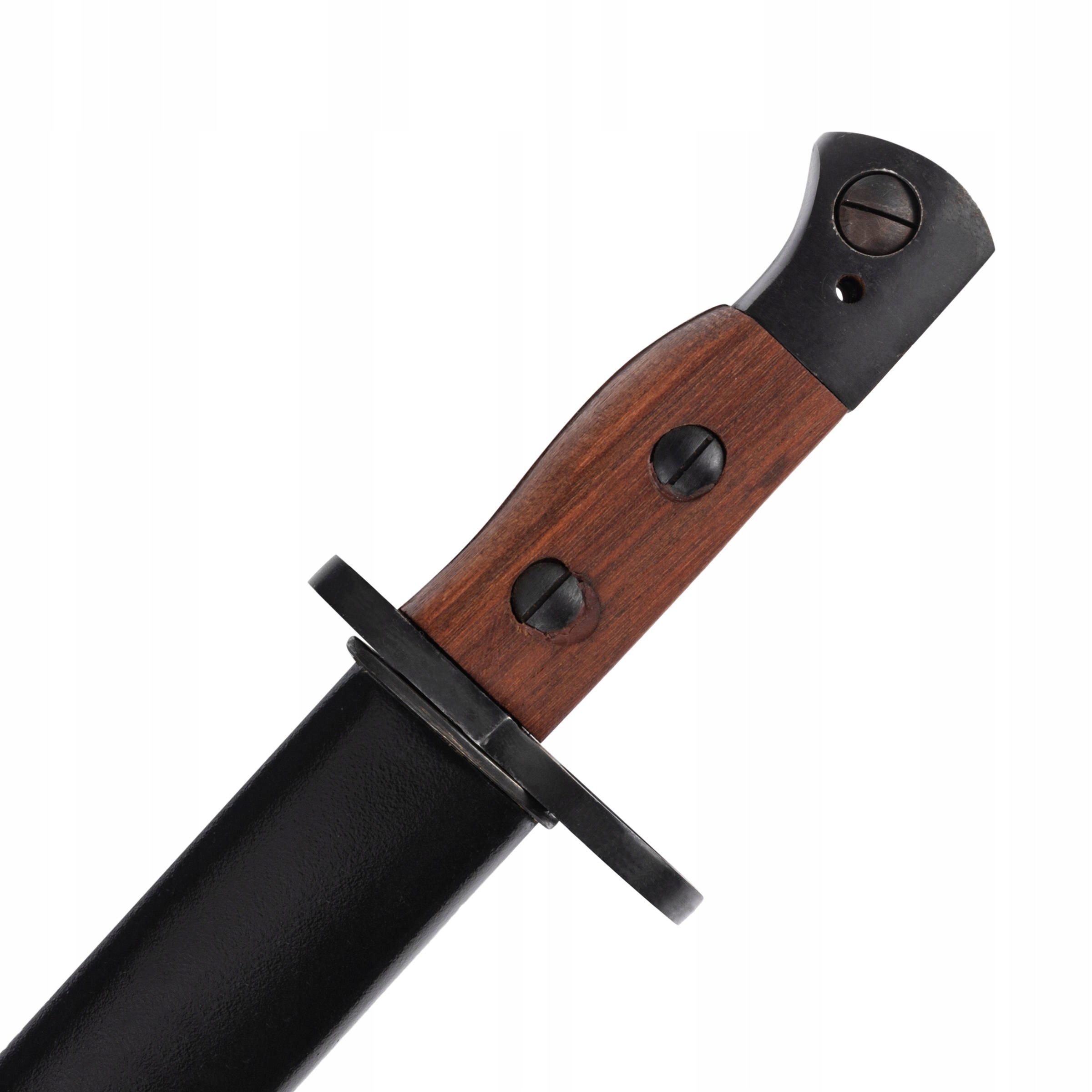 Точная копия британского штыка конца войны № 1. 5. Штык и ножны изготовлены из оксидированной стали, ножны имеют кромку из латуни. Штык имеет накладки из дерева, которые крепятся к рукоятке двумя винтами. Ножны окрашены в черный цвет. Штык полностью пригоден для использования и может быть прикреплен к винтовке. Штык и ножны не имеют каких-либо маркировок. Штыки №. 5 были предназначены для использования воздушно-десантными войсками и войсками, сражавшимися в Европе, но они также использовались в боях в Азии для винтовок № 5. 5 Mk I.