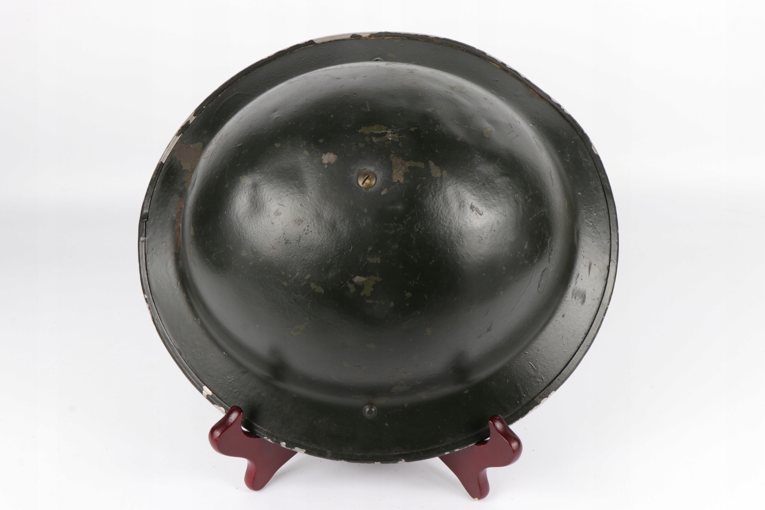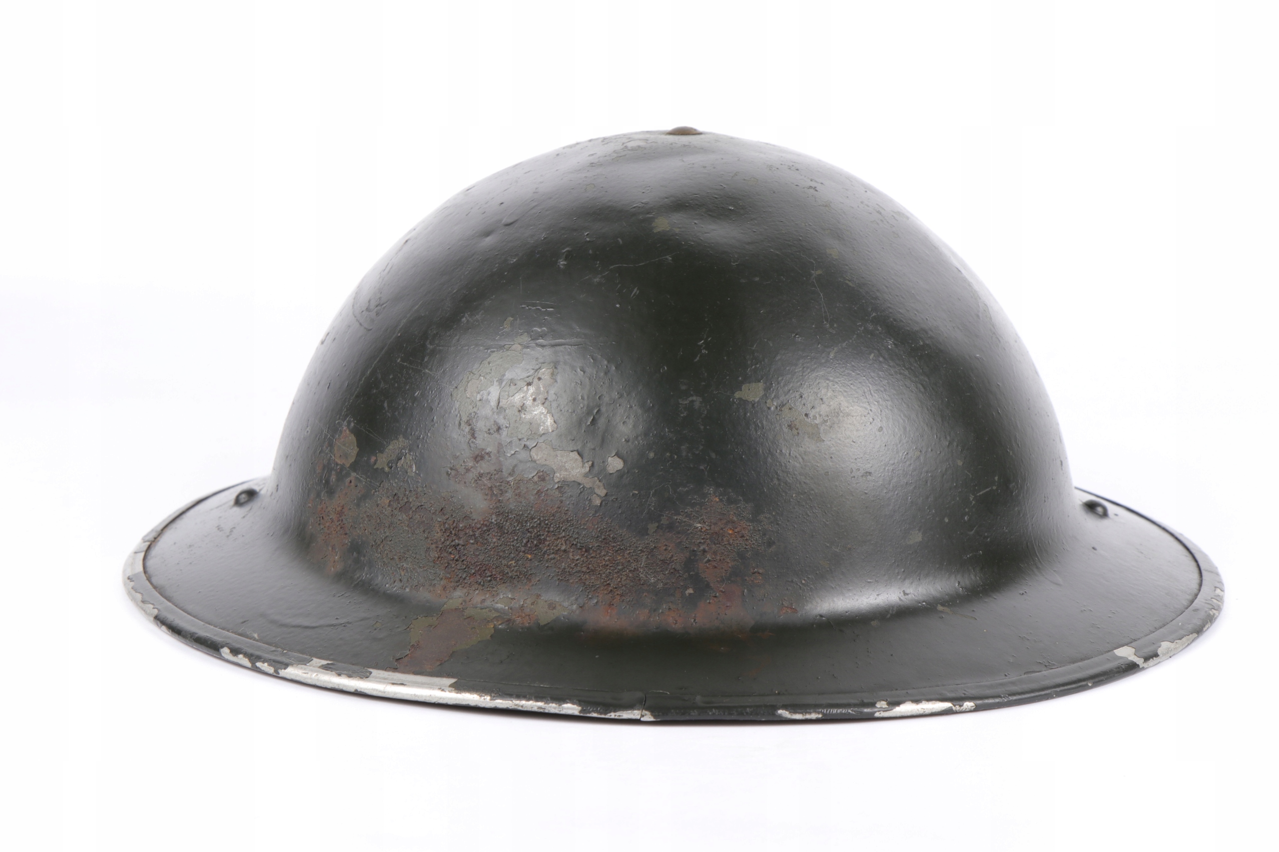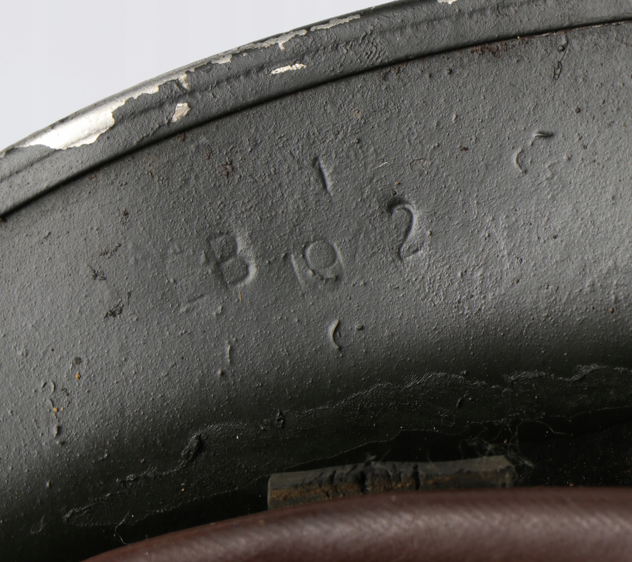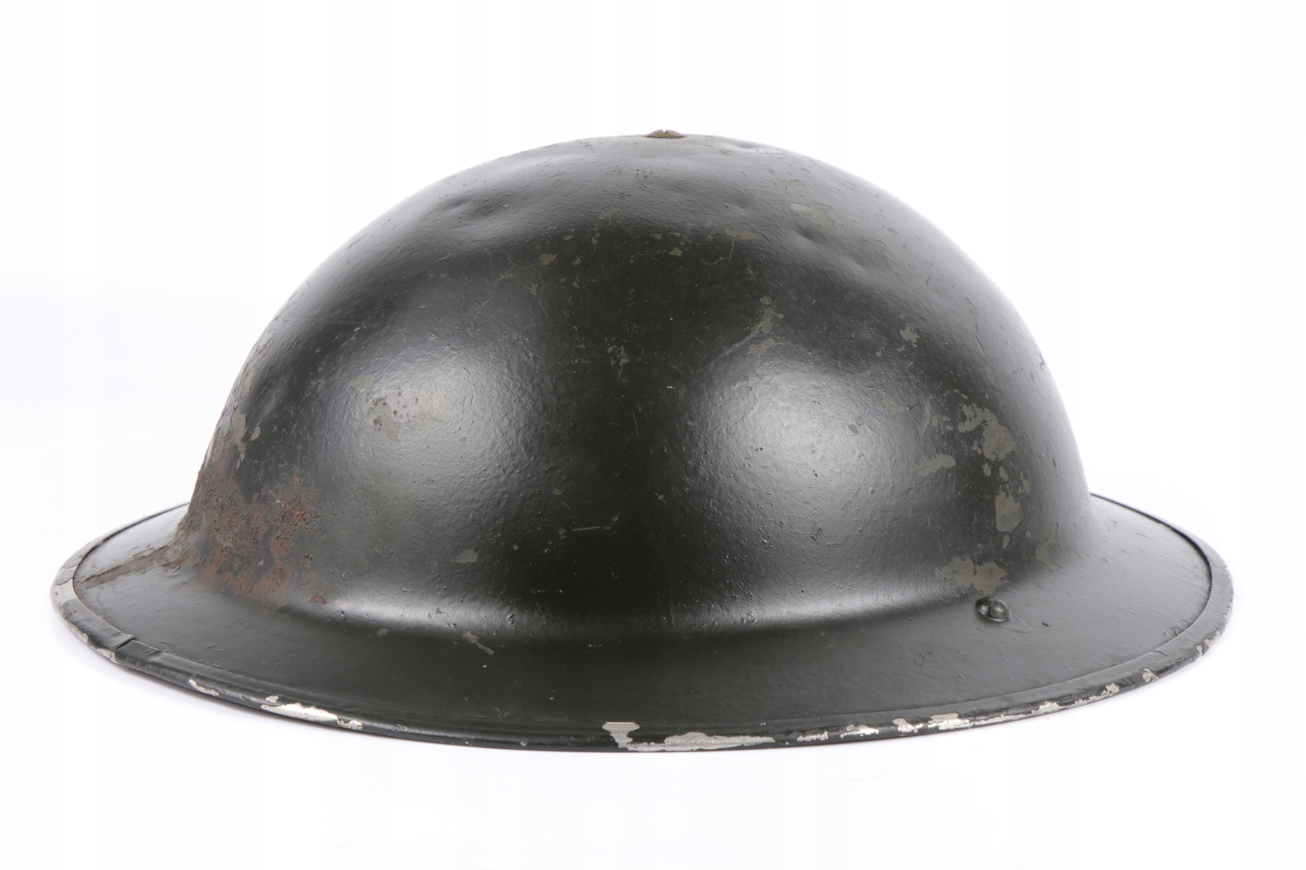 Британский шлем Mark I Brodie с датой 1942 года, дата выбита на внутренней кромке шлема. Рядом с датой EB или CB. В месте коррозии видна утрата черной краски, под ней зеленая краска, шлем изначально был зеленый.