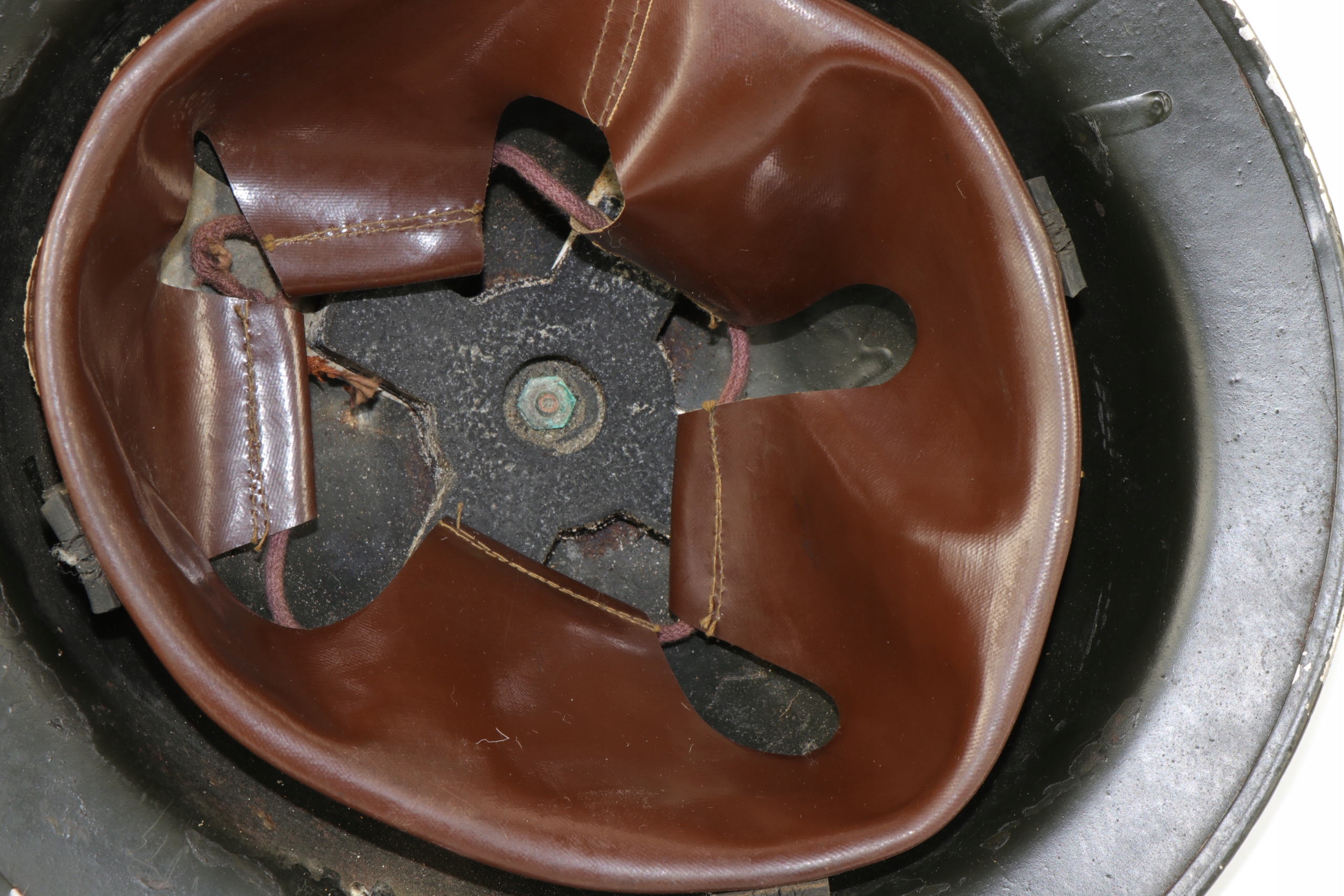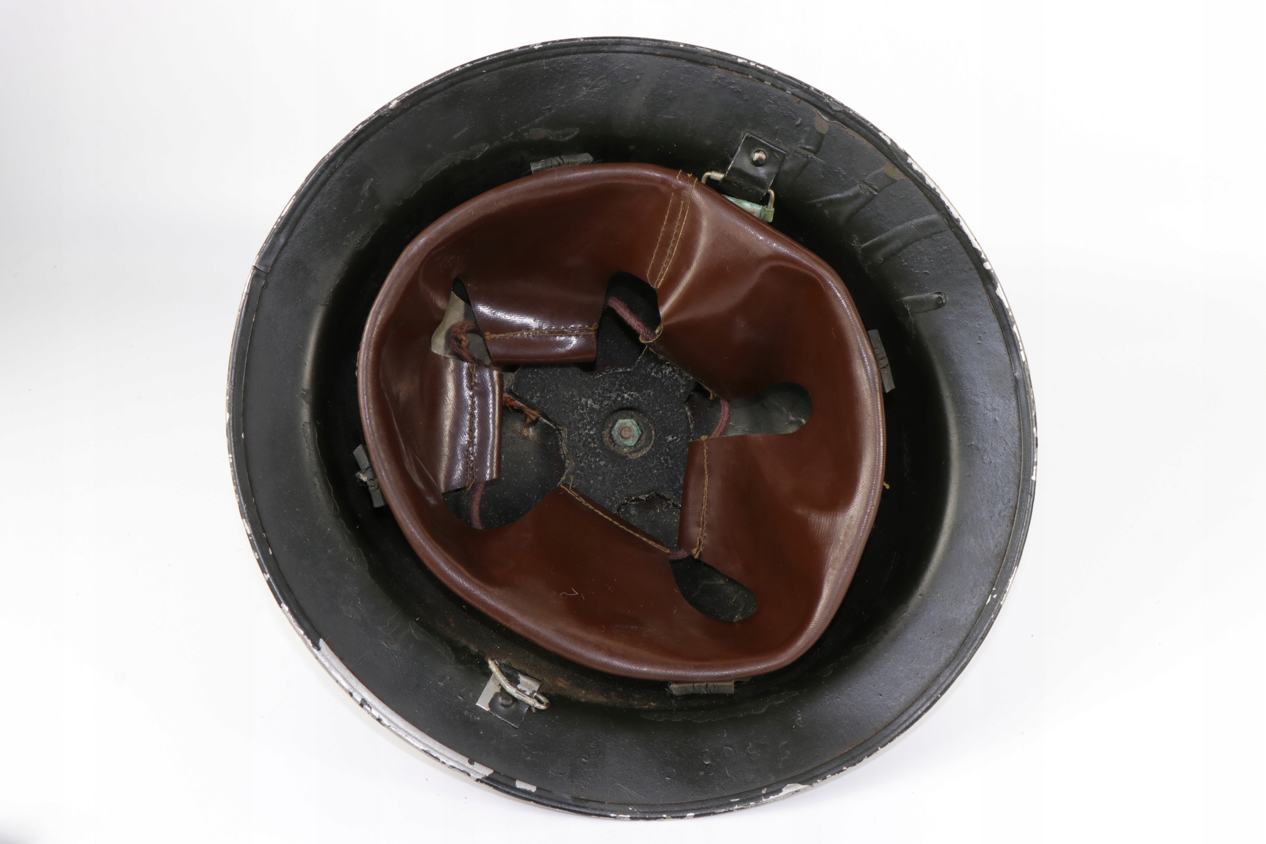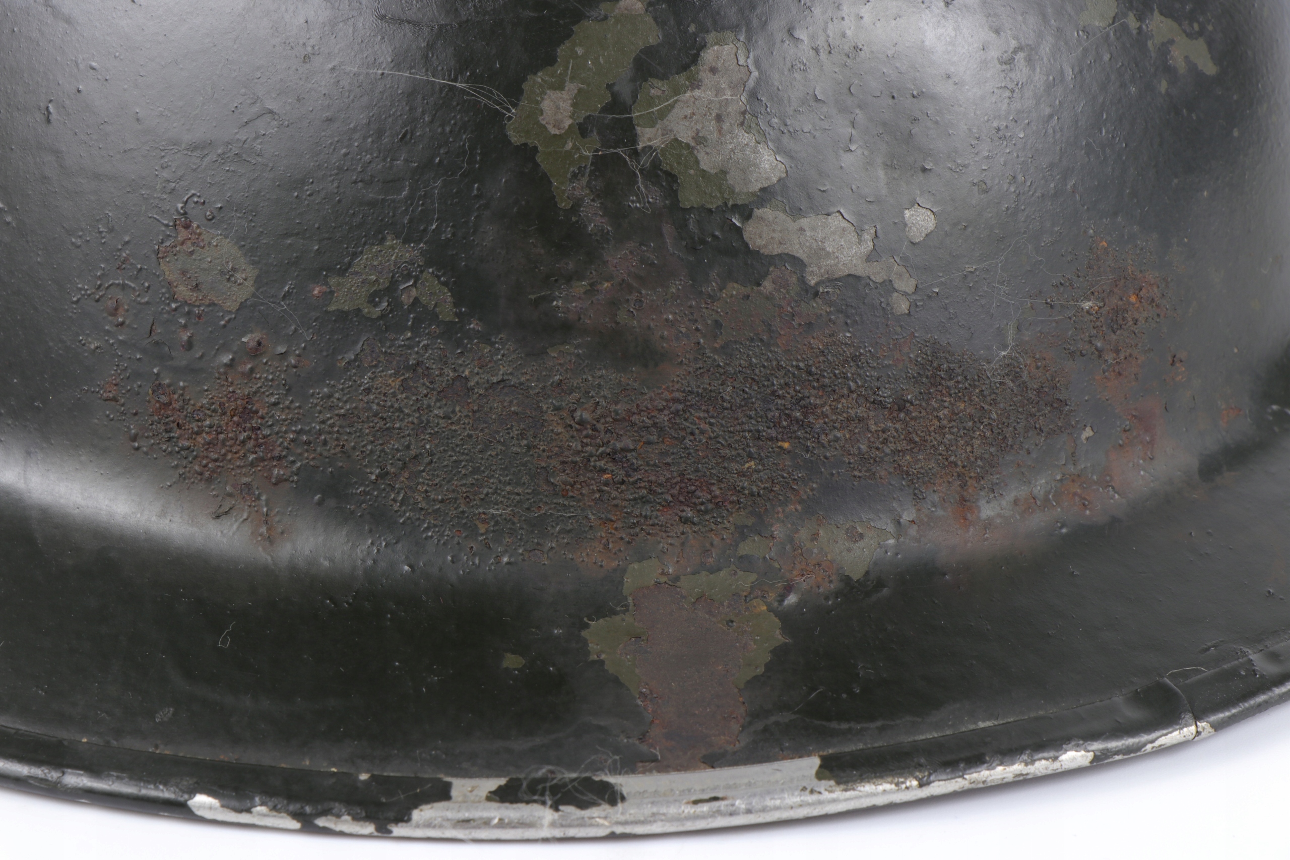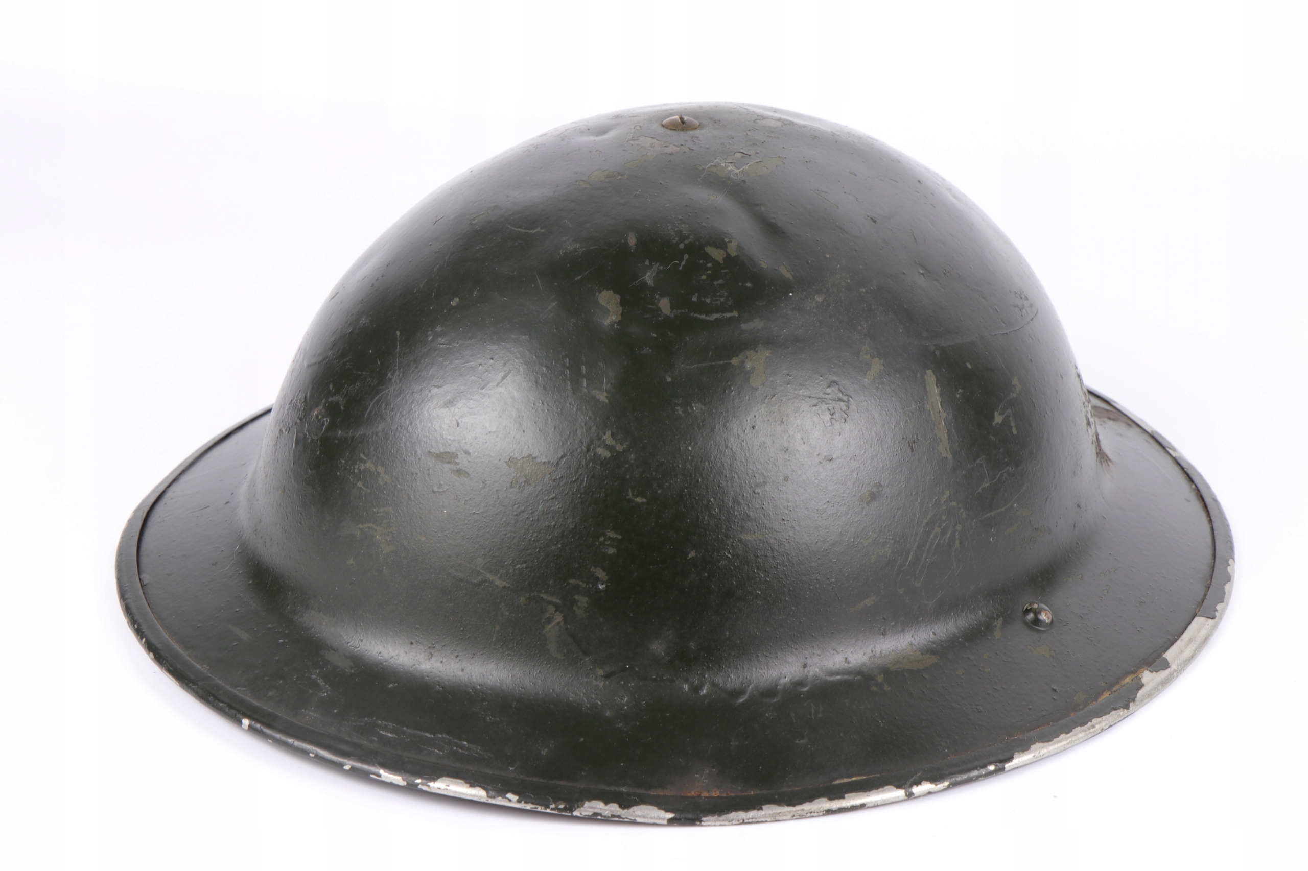 Британский шлем Mark I Brodie с датой 1942 года, дата выбита на внутренней кромке шлема. Рядом с датой EB или CB. В месте коррозии видна утрата черной краски, под ней зеленая краска, шлем изначально был зеленый.
