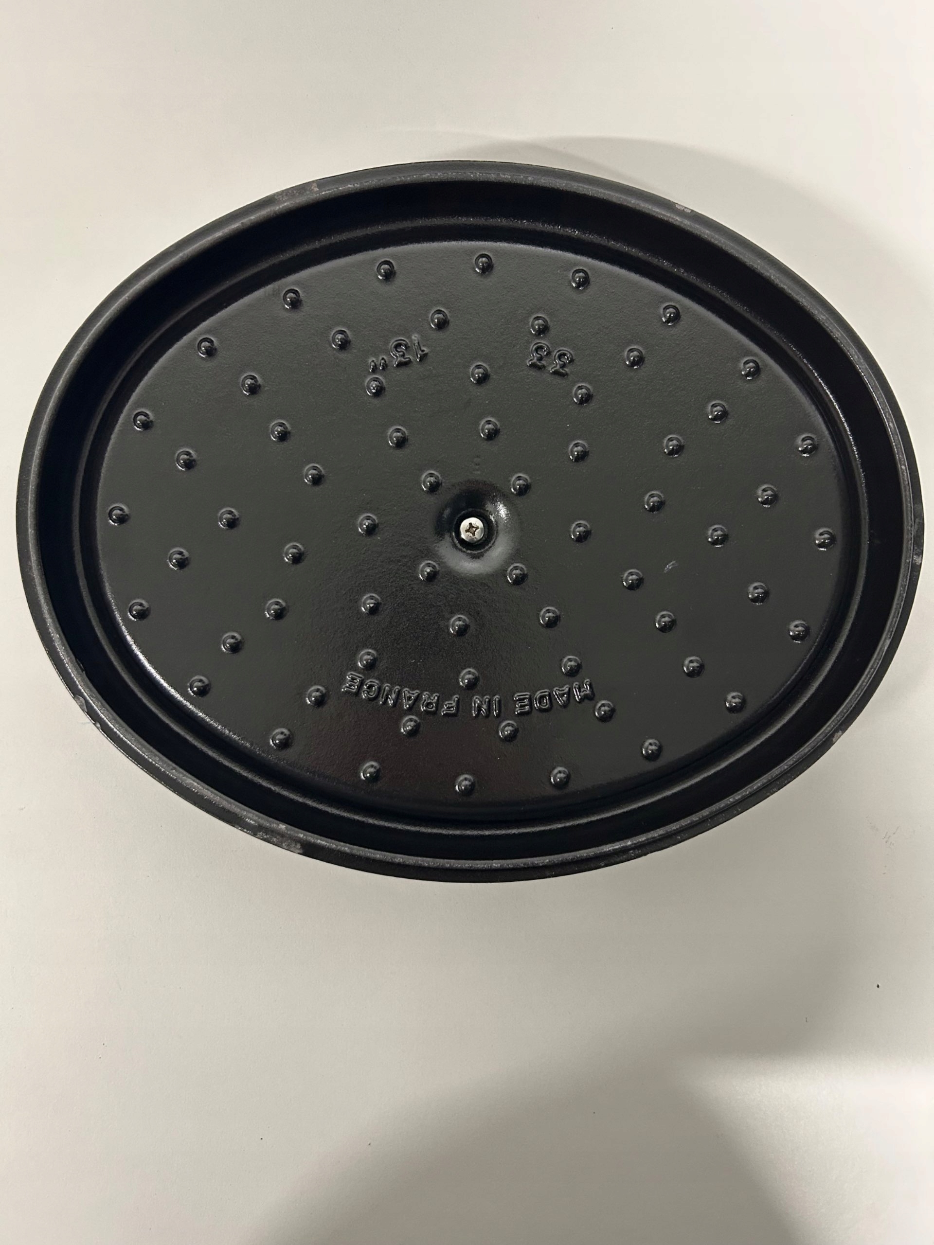 Овальная эмалированная чугунная сковорода емкостью 6,7 л, идеальна для жарки, медленного приготовления и стильной подачи мяса, рыбы, фруктов или овощей.