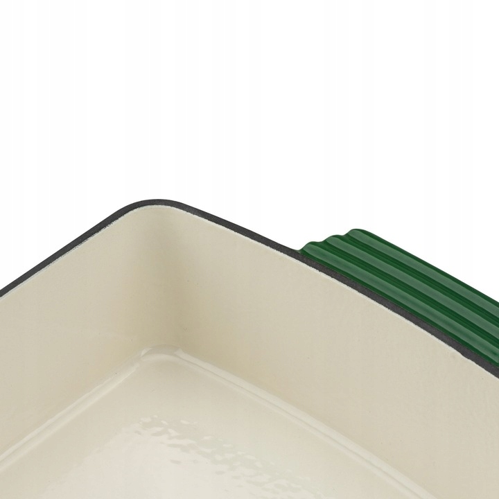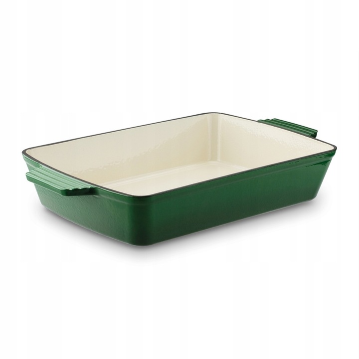 • Зеленая эмалированная чугунная сковорода Konighoffer размером 39 x 23 x 7 см прямоугольная, тяжелая и прочная. В нем можно запечь самые разные блюда: от запеканок до птицы. При использовании представленного блюда в духовке не превышайте температуру 250 градусов С. Однако изделие позволяет нагревать блюда в течение многих часов, поэтому оно прекрасно подходит, например, для запекания птицы целиком (например, утки). Он также очень хорошо удерживает поглощенное тепло. Вы можете использовать его на газовых, электрических, керамических и индукционных плитах. В комплект поставки модели не входит крышка, но это не проблема. Его потенциал позволит вам приготовить множество домашних рецептов, которые понравятся всей семье. В такой жаровне можно легко приготовить рождественские блюда. Нетоксичная эмаль защитит все ингредиенты от прилипания и облегчит мытье изделия. Модель имеет классический вид и сможет подчеркнуть уютный интерьер вашей кухни. В нем можно даже испечь традиционный хлеб на закваске. Чугунная жаровня без крышки Konighoffer рекомендуется, в частности, для выпечки блюд для детей, пожилых людей и людей, страдающих аллергией. Это один из лучших вариантов в этой категории!