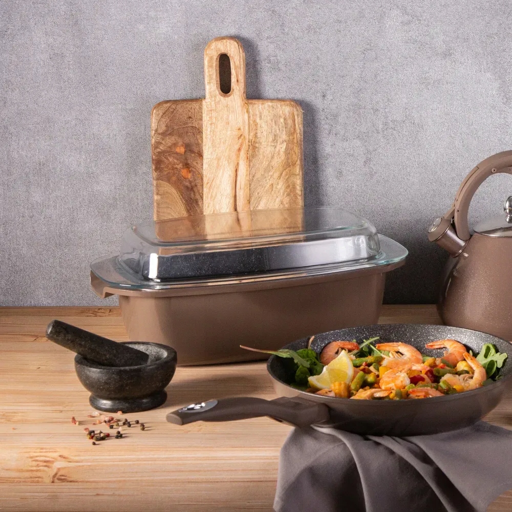 Современный землистый оттенок коричневого и элегантные детали позволяют посуде Valdinox Explore прекрасно вписаться в любую кухню, а ее универсальность позволяет использовать ее на всех типах плит, включая индукционные.