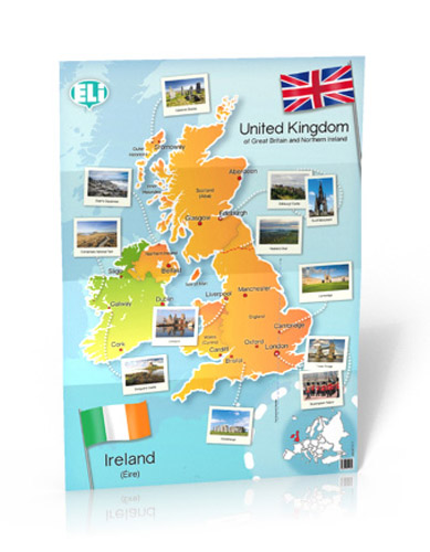 Образовательный плакат формата 67,6x98 см с изображением карты Соединенного Королевства Великобритании и Северной Ирландии и Ирландии с их официальными названиями и государственными флагами.