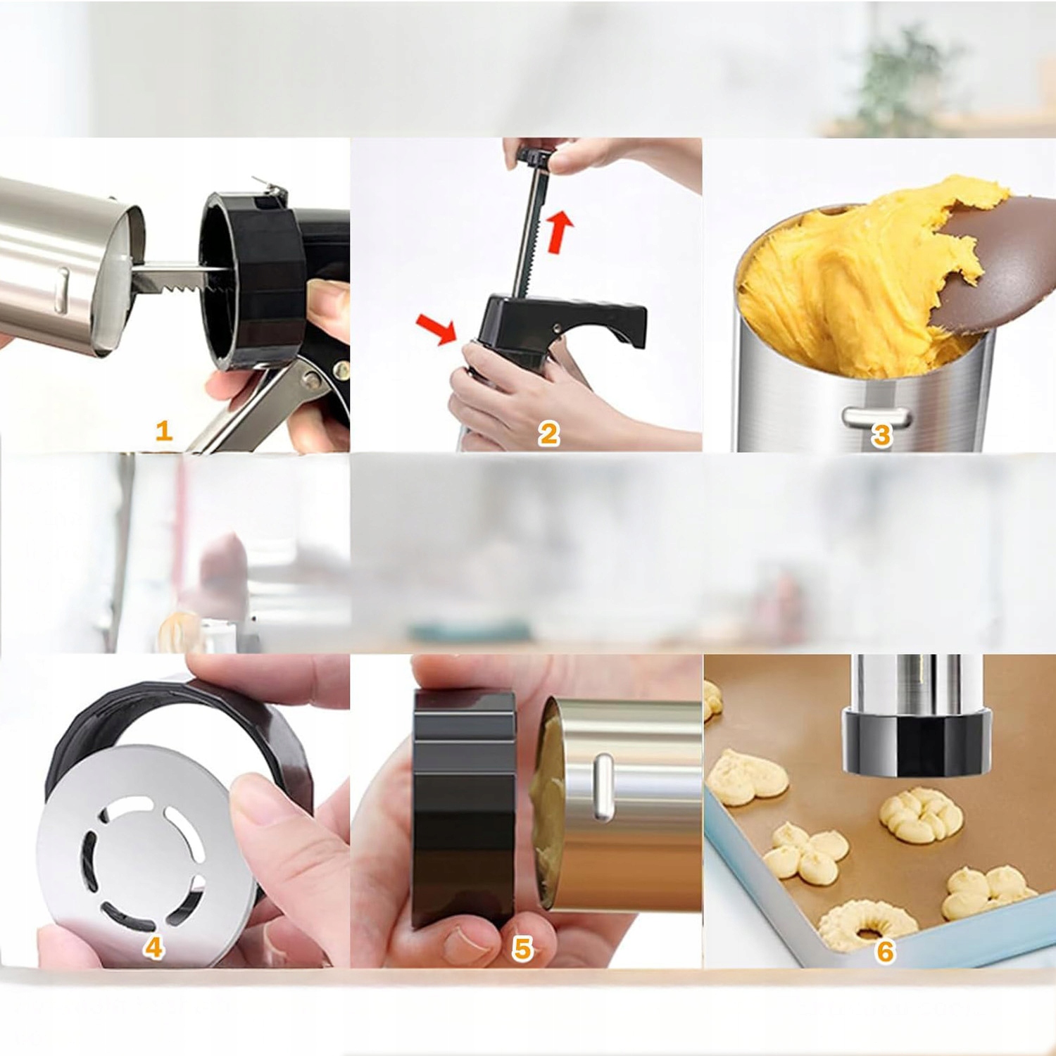 🍪🍩 Простота в использовании: Просто заполните шланг тестом, выберите подходящий диск или насадку и поместите его в машину для печенья, вставьте диск или насадку в крышку и затяните, затем нажмите на ручку. Идеально подходит для новичков.