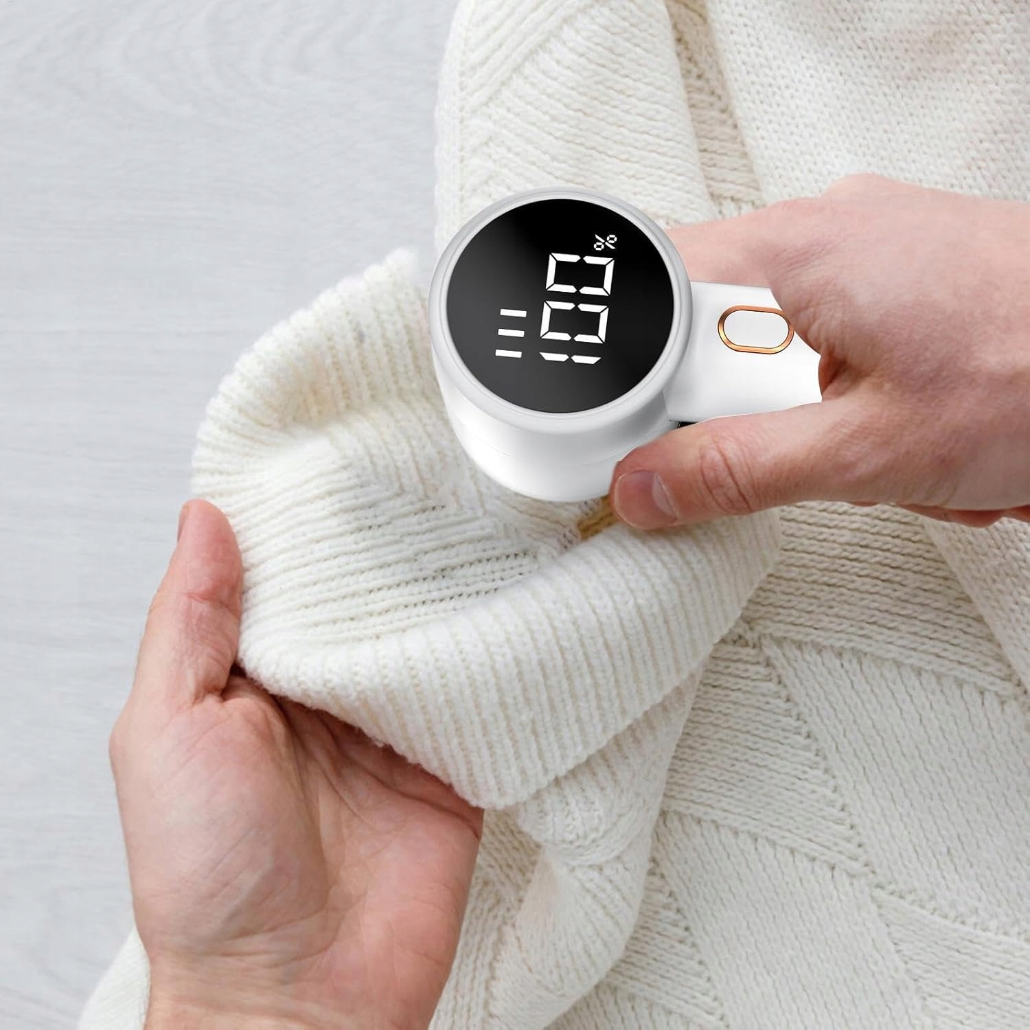 Наше оборудование для удаления полетов из одежды оснащено светодиодным дисплеем, на котором ясно видно текущий уровень заряда аккумулятора и скорости