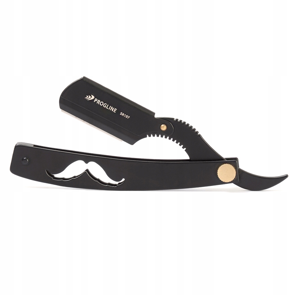 Изделие SR107 – это профессиональная, качественная черная парикмахерская бритва, которая подходит как для бритья и растушевки волос, так и для различных видов отделочных работ. Лезвие бритвы представляет собой половину лезвия классической бритвы. На ручке вырезан узор мужских усов, благодаря чему эта модель выглядит чрезвычайно оригинально и вне времени. Эта бритва обеспечивает комфортную и точную работу.