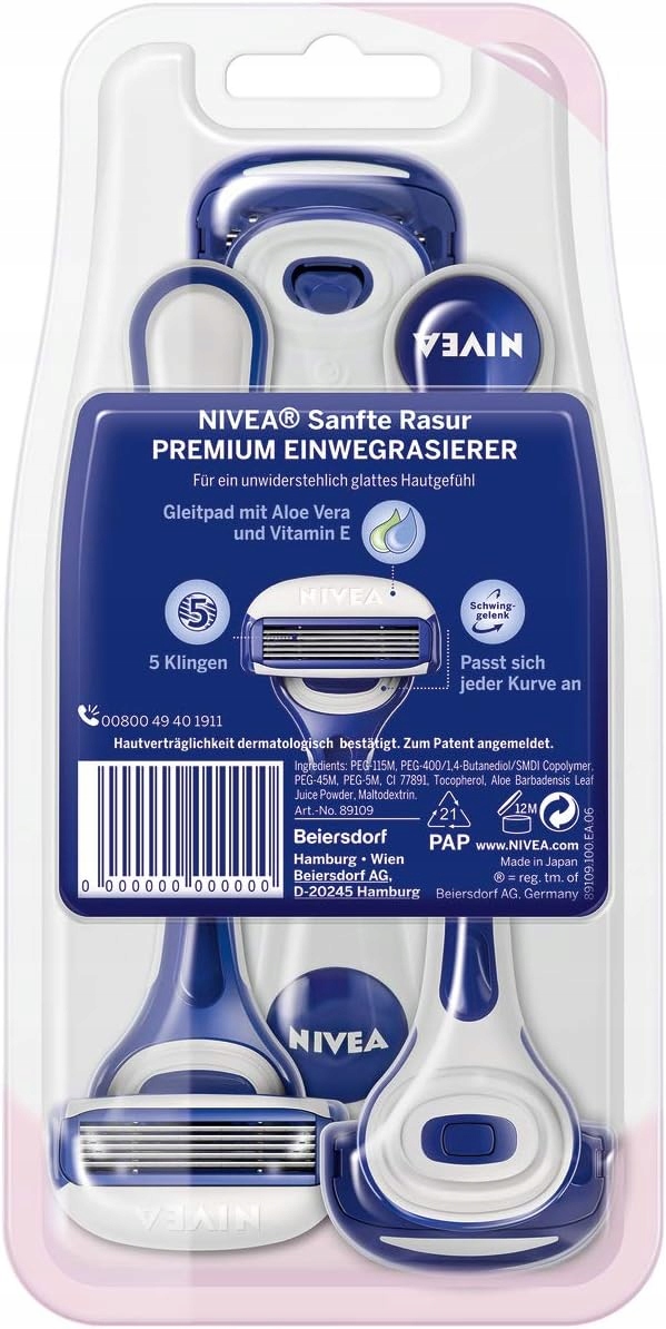 Неправильно гладкая кожа. Первая машина для бритья для женщин с роторным суставом. Он адаптируется к форме тела во всех направлениях. Раздвижная подушка Nivea с алоэ и витамином E, встроенная в тонком бритье. Увлажняющая подушка Nivea с алоэ и витамином E образует увлажняющий слой на коже и обеспечивает тонкое, приятное бритье. Для неправильного плавного ощущения кожи: одноразовая машина для бритья Nivea. Немецкий -------------------------------------------------------------