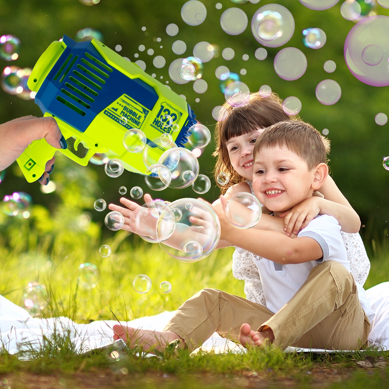 Налейте жидкость в емкость, идущую в комплекте, а затем погрузите в нее отверстия в передней части пистолета. Нажмите на спусковой крючок базуки и все! С этого момента вы можете наслаждаться видом красивых, радужных пузырей, парящих в воздухе, вылетающих сразу из 32 отверстий!