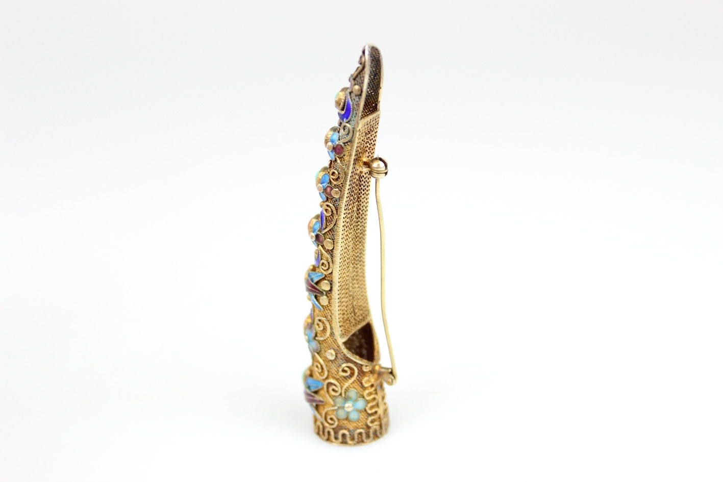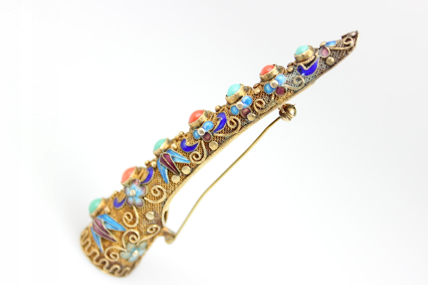 Openwork, богато украшенная китайская брошь с 50 -х годов 20 -го века. Строительство, сделанное с использованием филигранной техники в золотом серебра, подписано характерным серебряным каламбуром, интимными камнями: натуральная бирюза и драгоценные кораллы. Закрепление с дополнительной защитой. Очень хорошее состояние. Размеры: