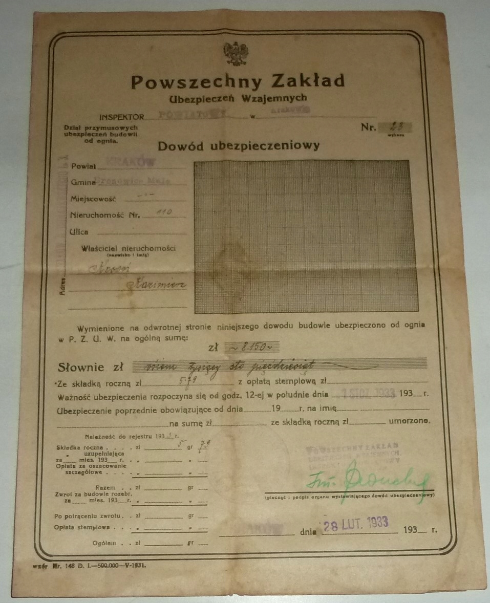 [Броновице Мале] Страховое свидетельство PZUw 1933 г.
