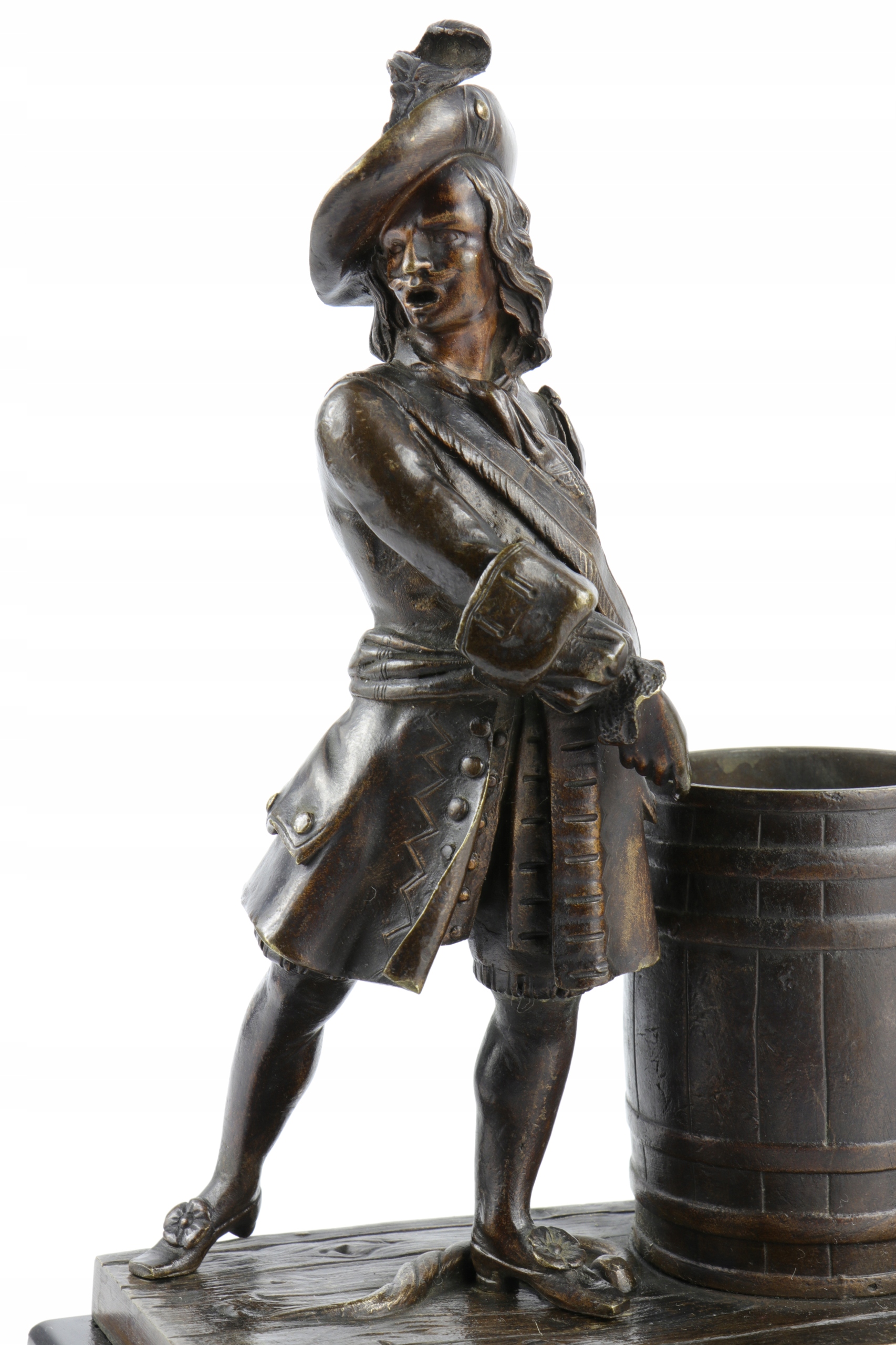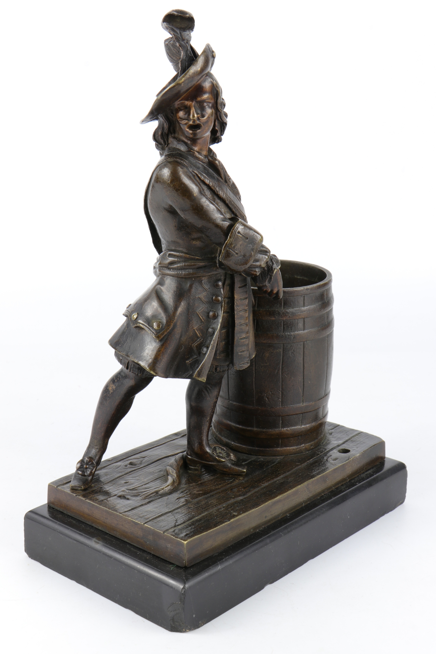 Очень интересная фигура, актерский состав, сделанный в бронзе. Фигура или столовая плата в форме мушкетера солдата, стоящего в бочке с порохом. Фигура не подписана, но качество и детали кастинга показывают, что она происходит от очень хорошей этикетки. Солдат в французском наряде восемнадцатого века. Очень подробный, тщательно смоделированный наряд, видимые зрачки и другие мелкие элементы.