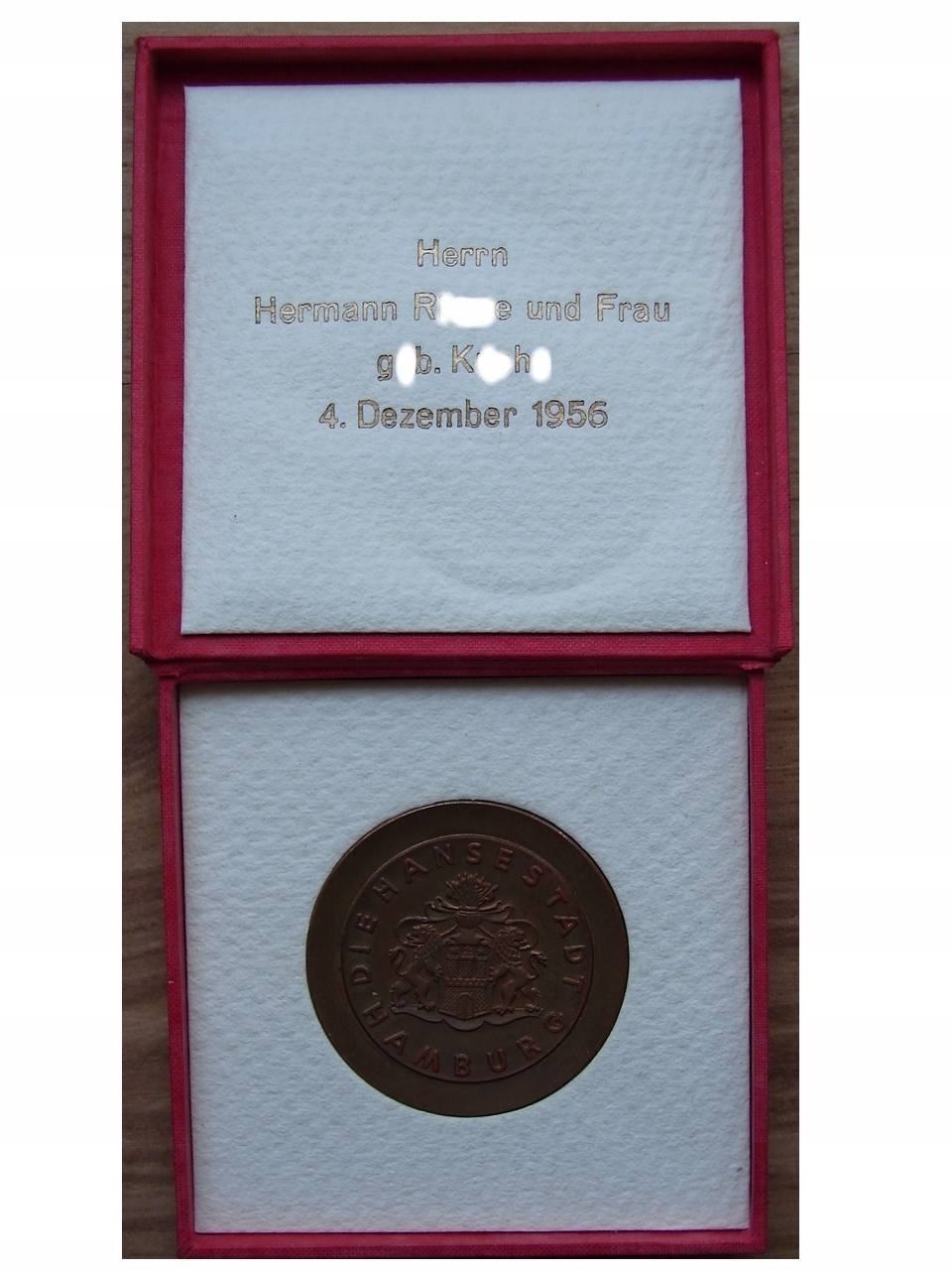 Золотая свадьба ганзейского города Гамбурга: бронзовая медаль в оригинальном футляре внутри с именами знатной пары от 5 декабря 1956 года. Футляр украшен гербом города с золотым тиснением на крышке.