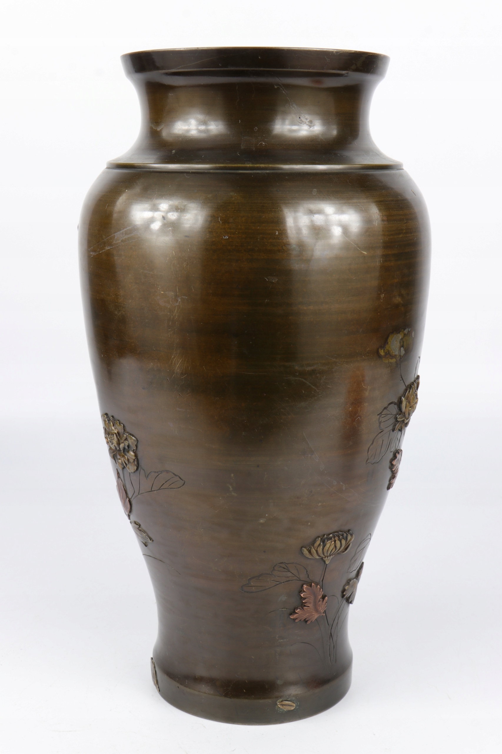 Ваза, отлитая из темной патинированной бронзы с рельефным цветочным декором. Украшение нанесено в виде инкрустации другим металлом. Возможно серебро или латунь. Вазы вышеуказанного типа использовались для традиционного японского искусства аранжировки цветов, известного как икебана. Ваза периода Мэйдзи 1862-1912 гг.