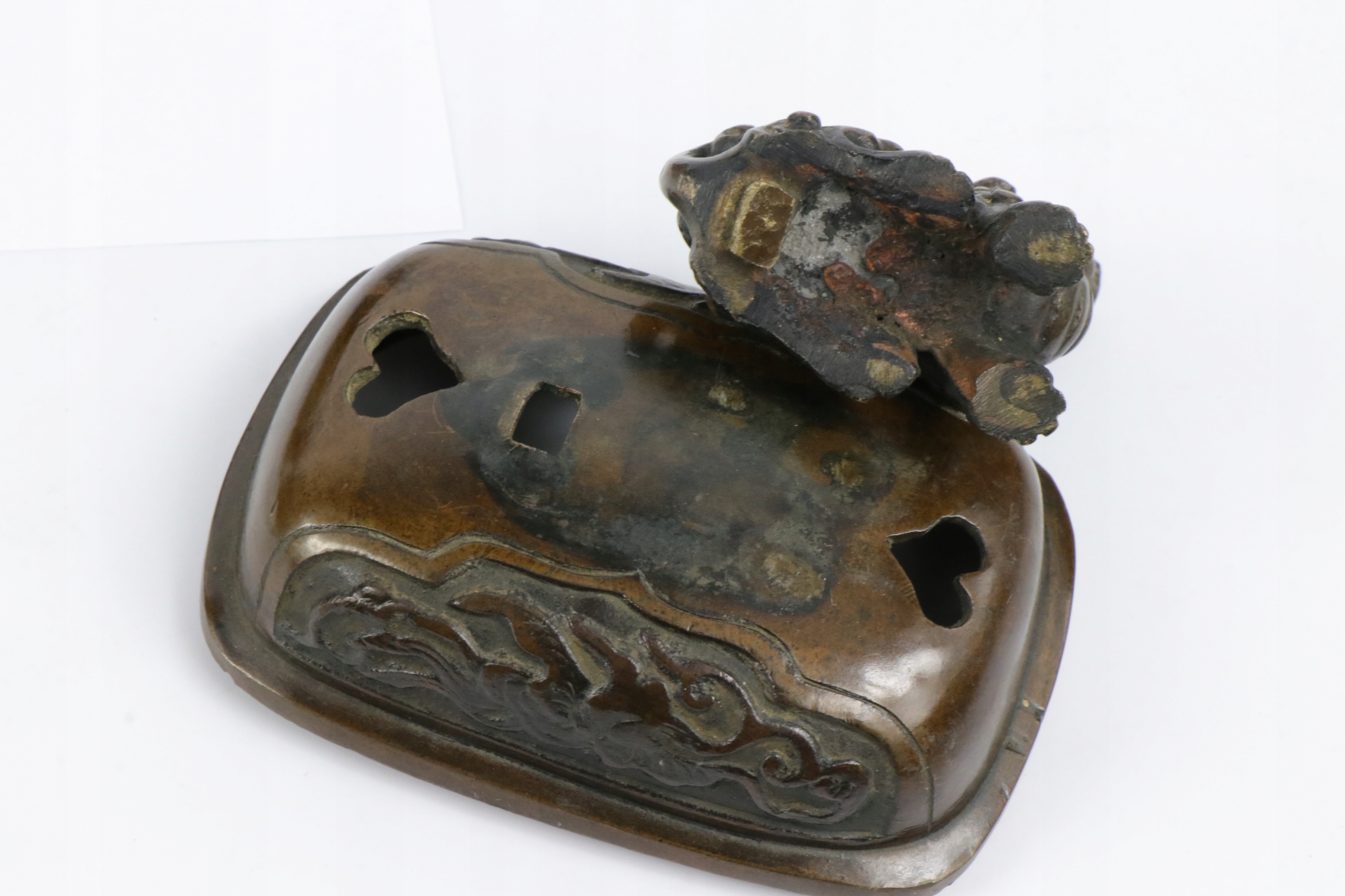 Состояние бронзы хорошее, без трещин и дефектов, только крепление льва на крышке разболталось (лев снимается с крышки), скорее всего требуется переналадка крепления.