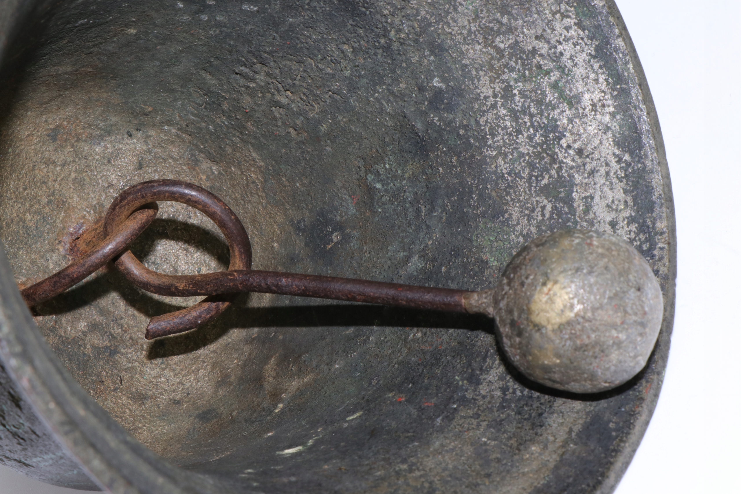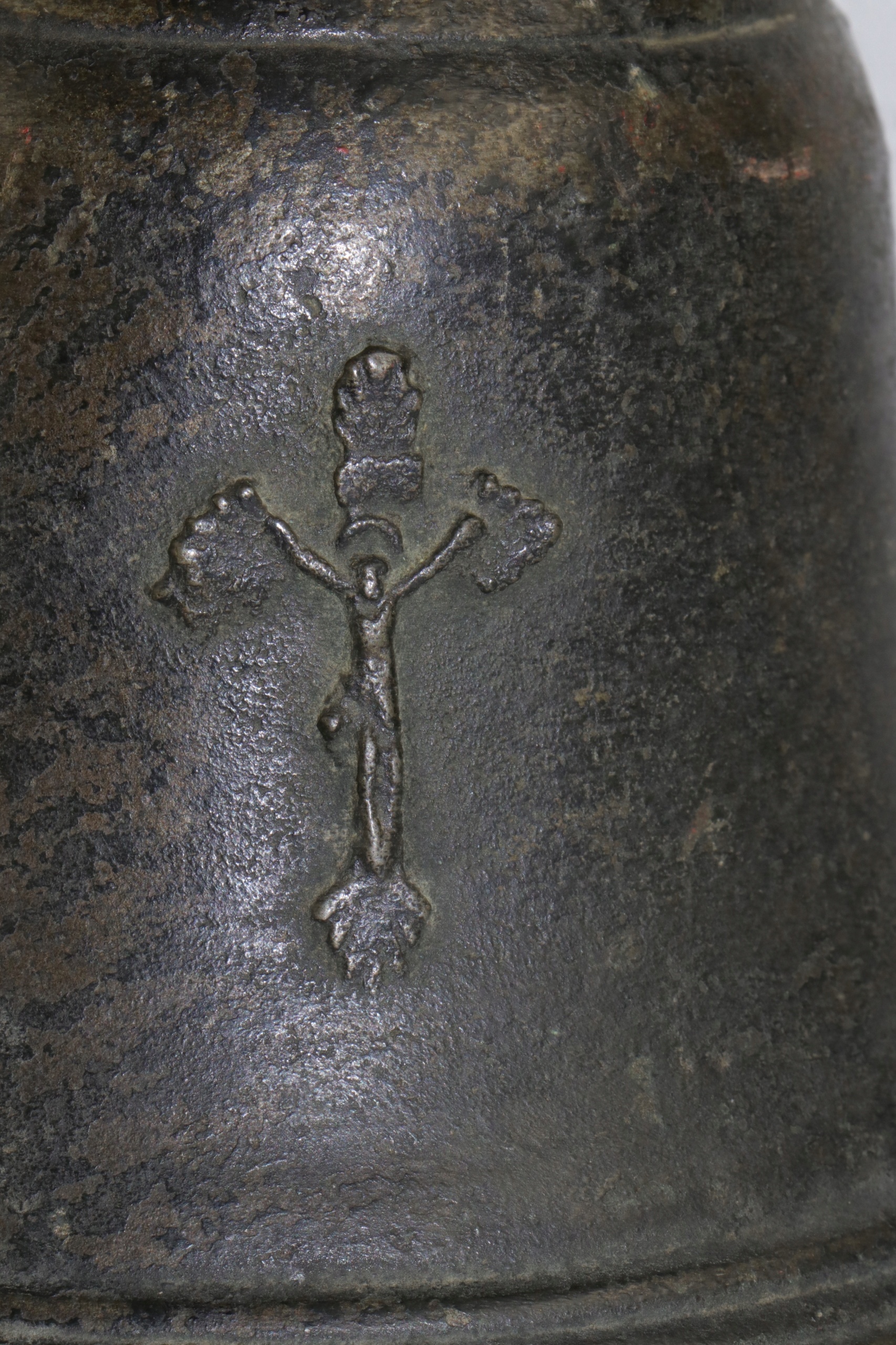 Интересный бронзовый кастинг с одной стороны с гербом Медичи, а с другой - с небольшим крестом Ренессанса с Иисусом Христом. Аналогичные колокола, описанные как колокольчики гонга, висели у ворот. Колокол кастинг в бронзе может быть с 17 -го 18 -го века и повесить у двери филиала какого -то банка Медичи во Франции Бельгии.