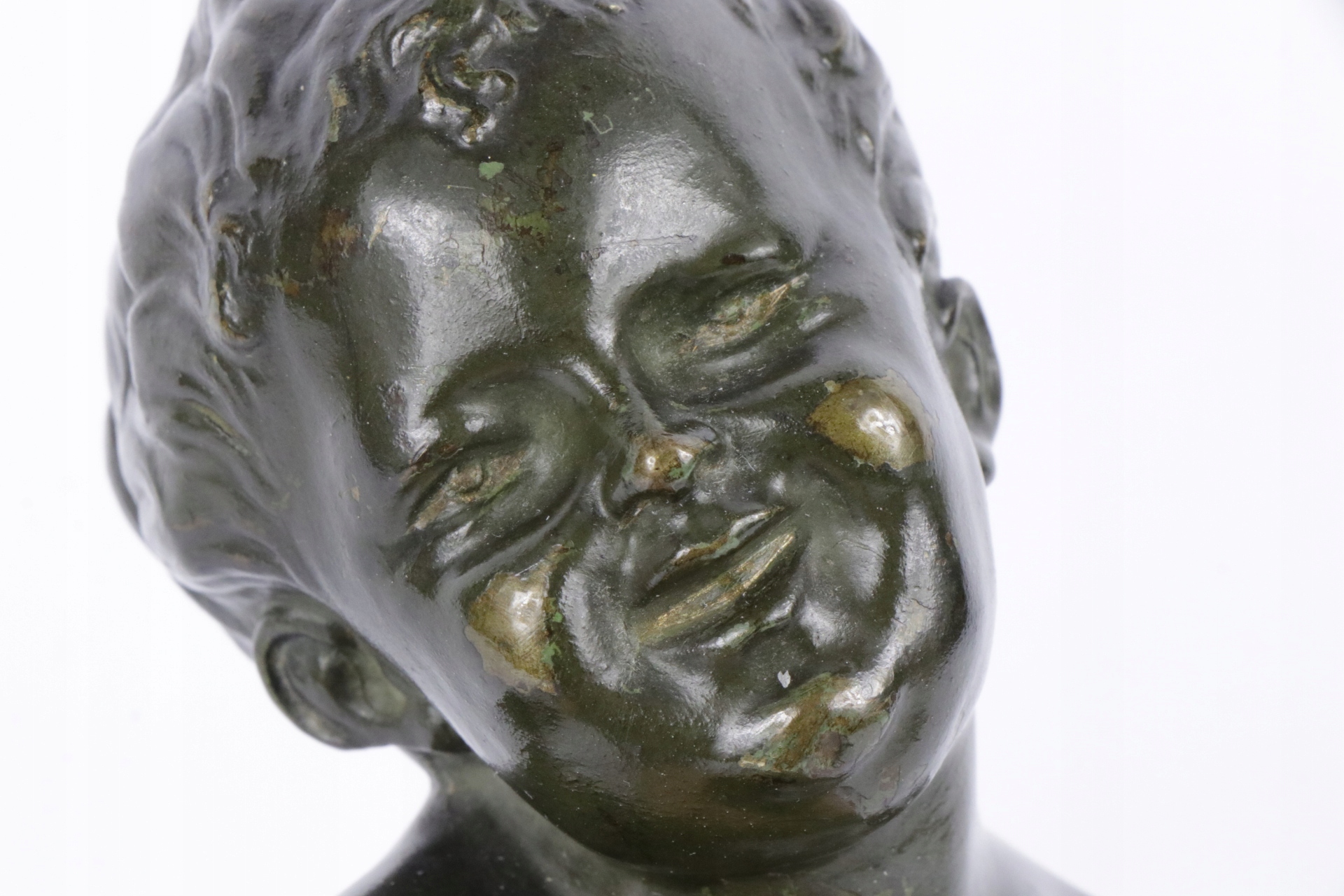 Бюст мальчика, отлитый из бронзы. Фигура создана по мотивам работы Франца Ксавера Мессершмидта, немецко-австрийского скульптора XVIII века в стиле барокко. По моему мнению, фигурка конца 19 века, но возможно и старше.