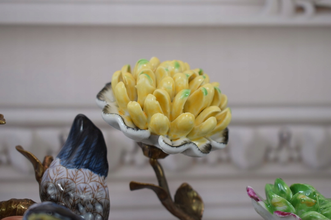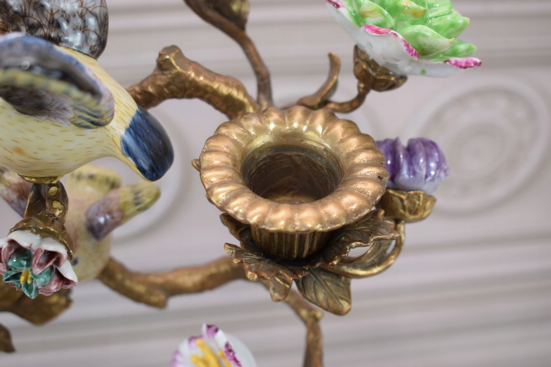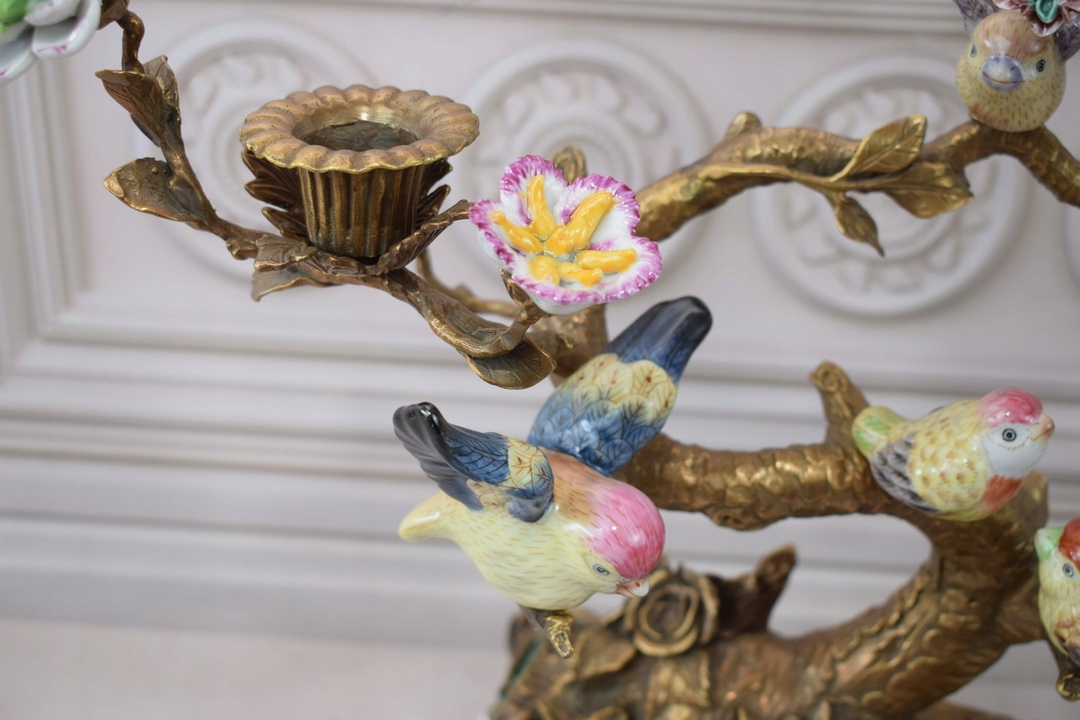 Бронзовый подсвечник + фарфор - птицы на отделении отделения - ссылочный номер