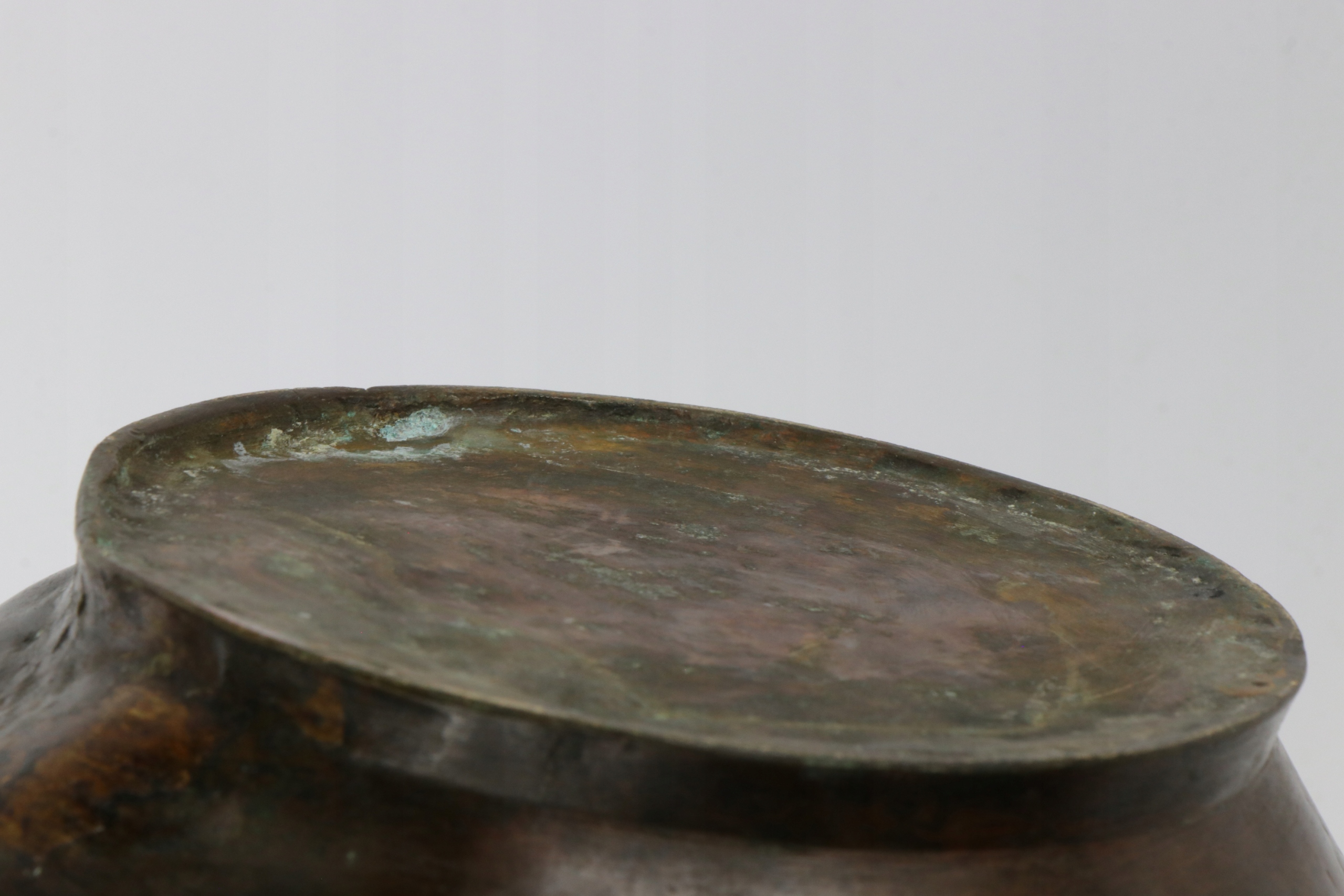 Как видно на фотографиях, состояние бронзы в нижней части, возле дна вазы, небольшая вмятина и следы ремонта. В остальном хорошее состояние. Внутри следы камня, отложенного водой.