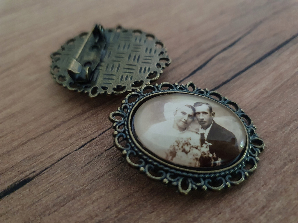 Стеклянная брошь для свадебного букета с присланными Вами фотографиями, графикой и текстом.
