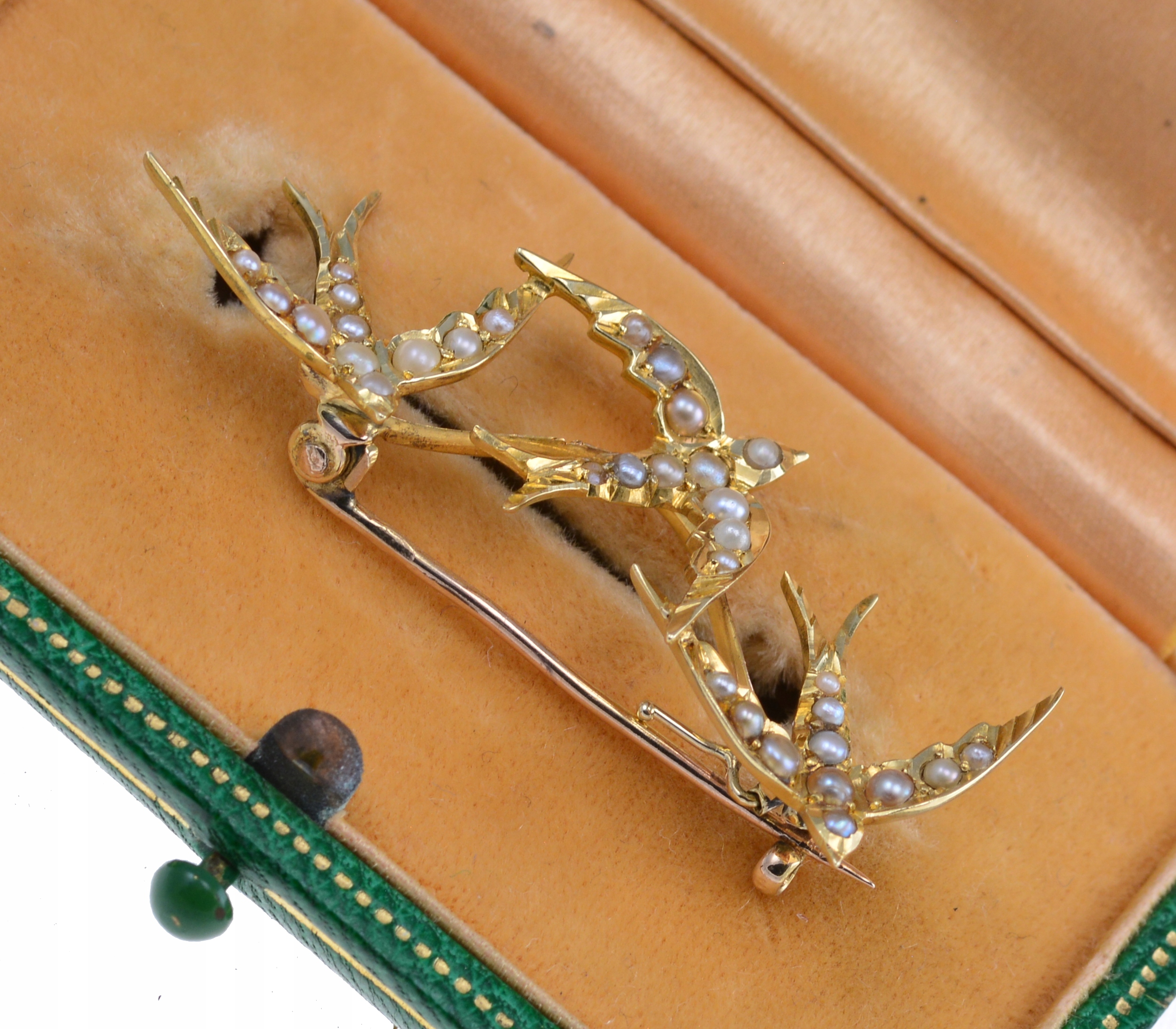 Предмет продажи — старинная викторианская брошь с изображением трех ласточек. в полете, украшенный нежным жемчугом. В викторианскую эпоху ласточки имели особое значение – они символизировали любовь, верность и благополучное возвращение домой. Три ласточки также могут символизировать прочные семейные узы, привязанность и верность. Украшения с этим мотивом были не только украшением, но и носителем глубоких эмоций, что было характерно для сентиментальной эстетики того периода.