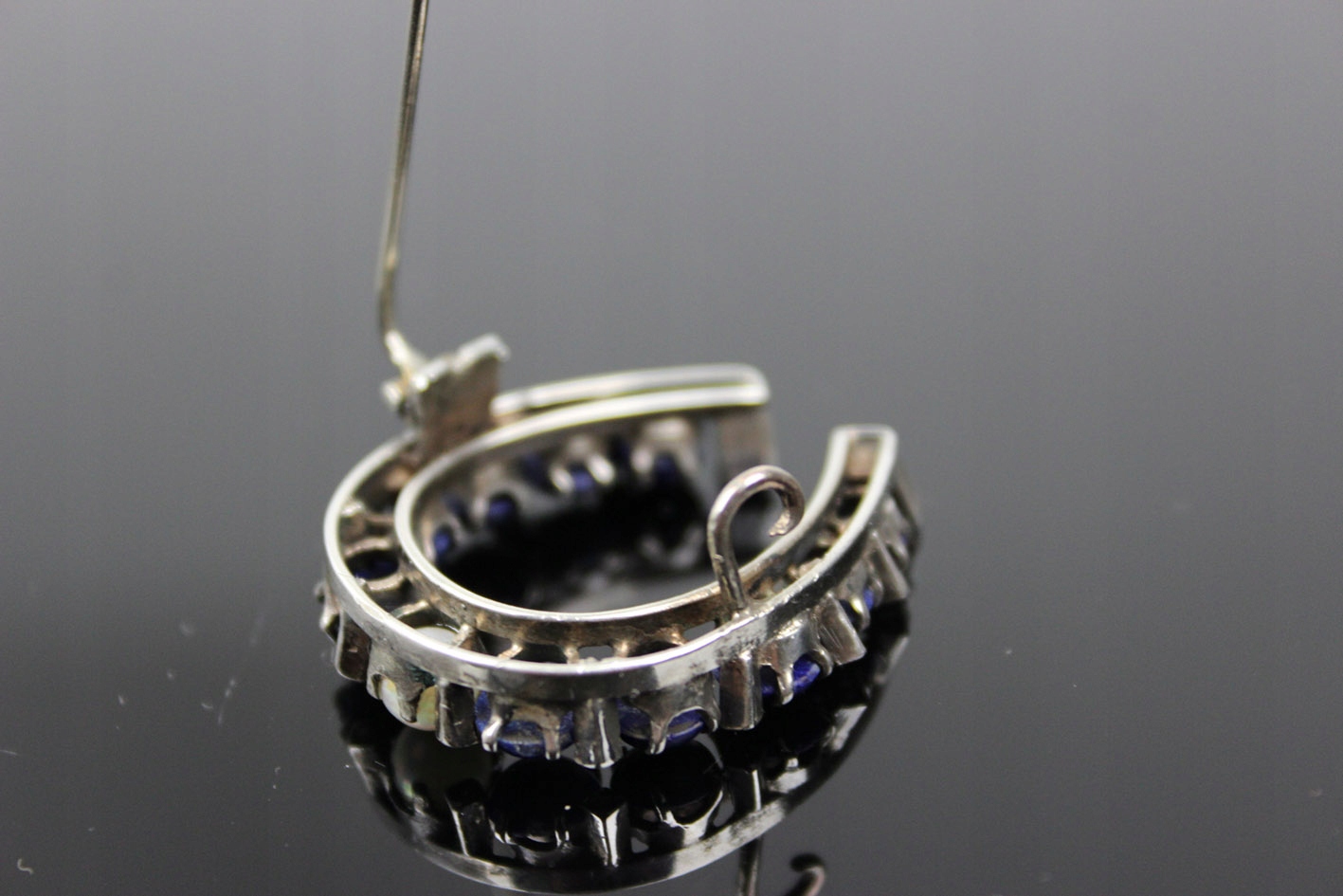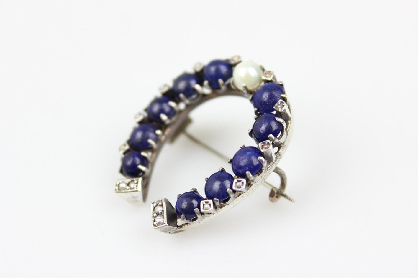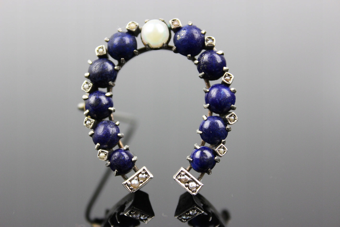 БРОШЬ-ПОДКОВА 19 ВЕКА С ЖЕМЧУГАМИ ЛЯПИТА, СЕРЕБРО