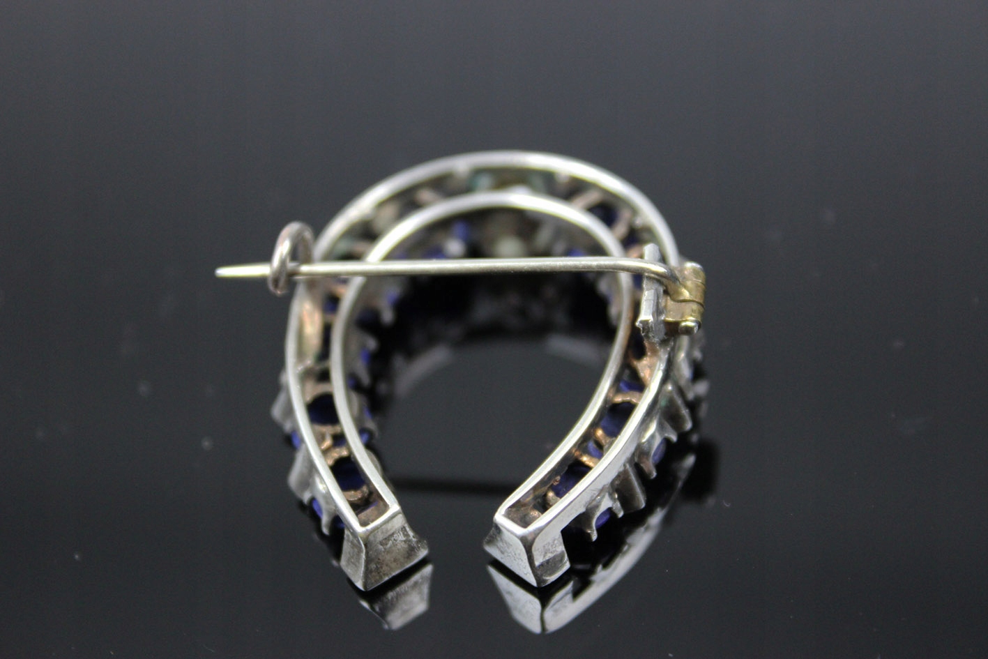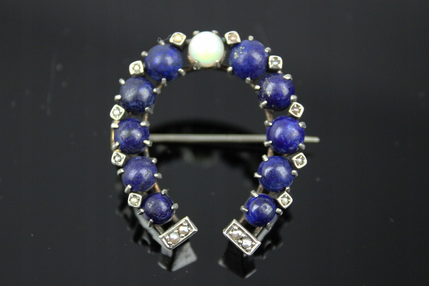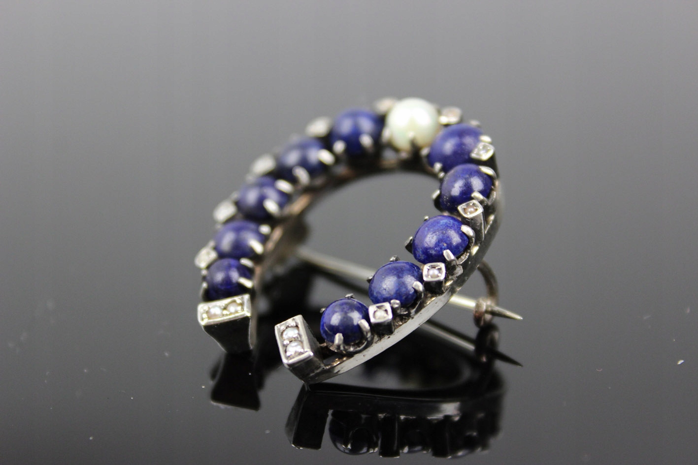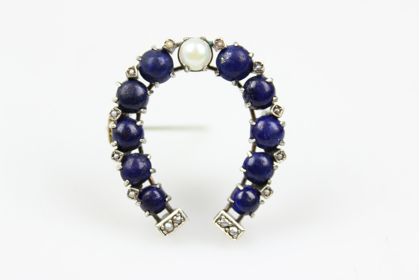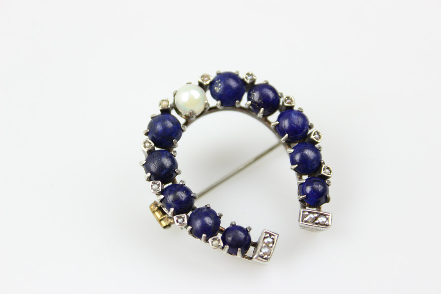Уникальная брошь в форме подковы, датируемая 1880-ми годами, которая является прекрасным примером изысканного ювелирного мастерства того времени. Выполненная из серебра, она восхищает сложной композицией: расположенная в центре жемчужина красиво контрастирует с глубоким темно-синим ляписом, которым украшена подкова. Внешние края и нижняя часть украшены рядом мелких жемчужин, что придает броши утонченную элегантность и неподвластное времени очарование.