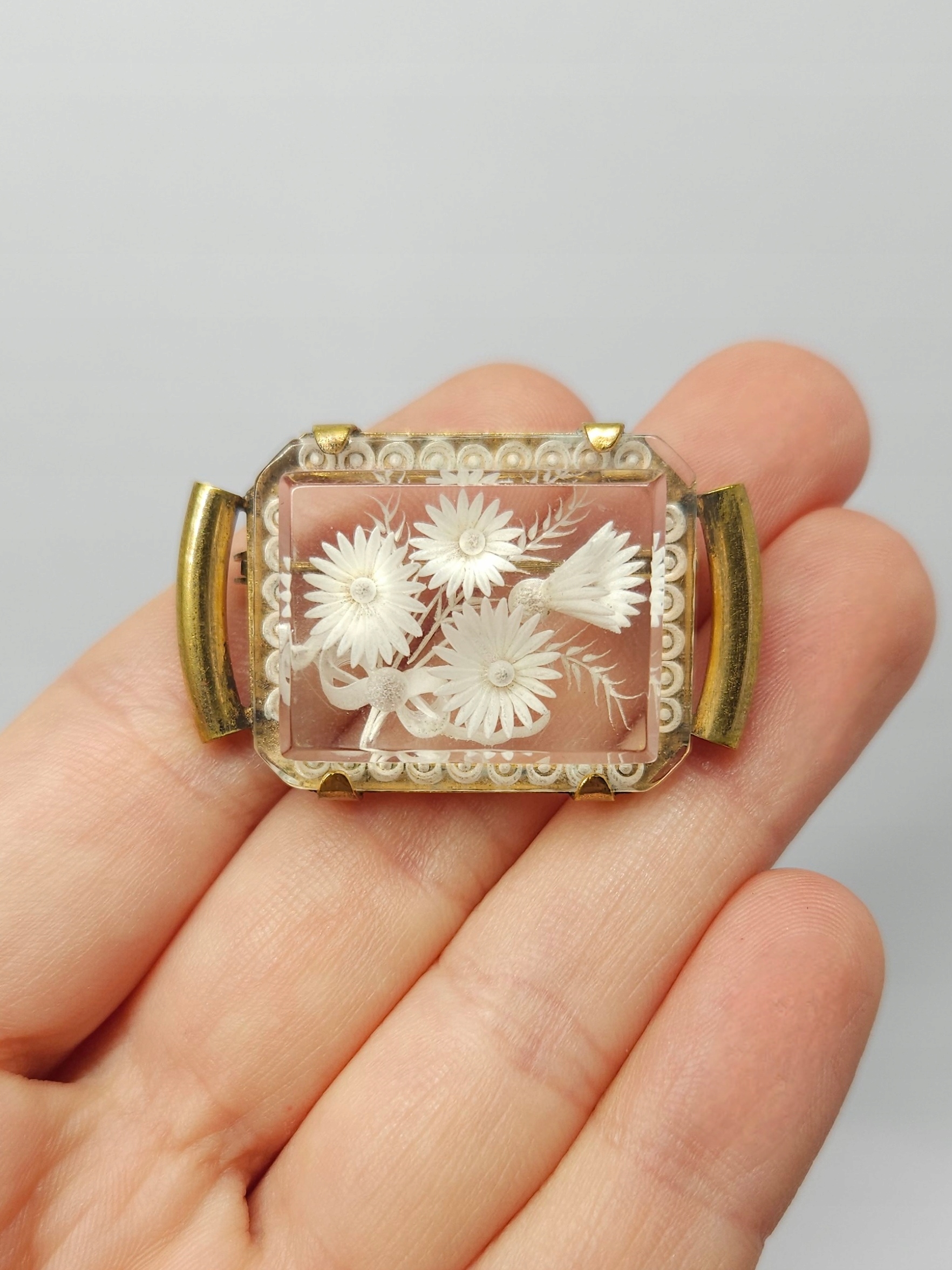 Брошь начало 20 века, глубокая резьба цветов, позолоченная латунь