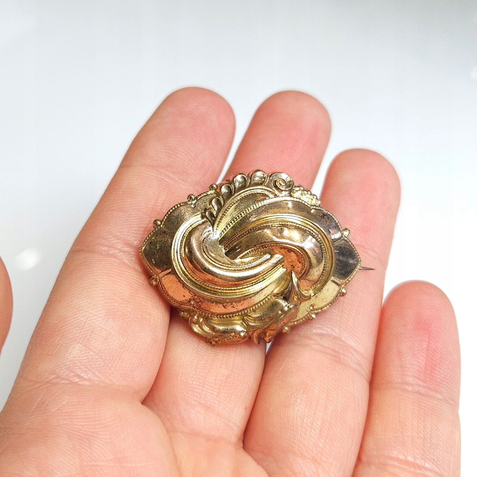 Предмет продажи эффектная, выпуклая брошь в стиле бидермейер, выполненная из позолоченной латуни, украшенная растительным мотивом.