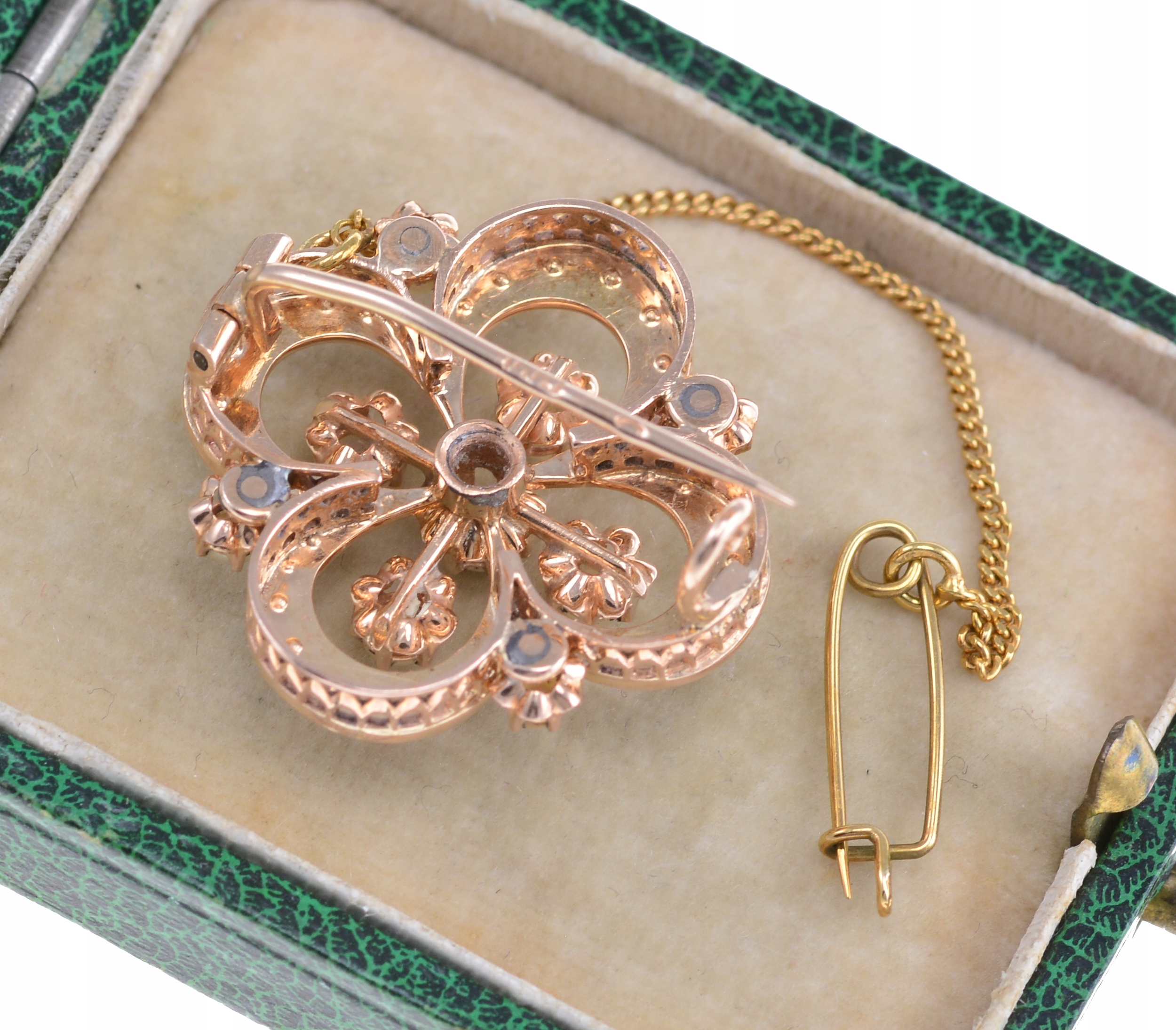 Предмет продажи — старинная золотая брошь с набором булавок с указанием времени восстаний 1853-1906 гг. Брошь в виде четырехлистного клевера, украшенная речным жемчугом. Брошь в идеальном состоянии, весь оригинальный жемчуг, застежка работает. Никаких следов ремонта. Красивое украшение, которому более 100 лет.