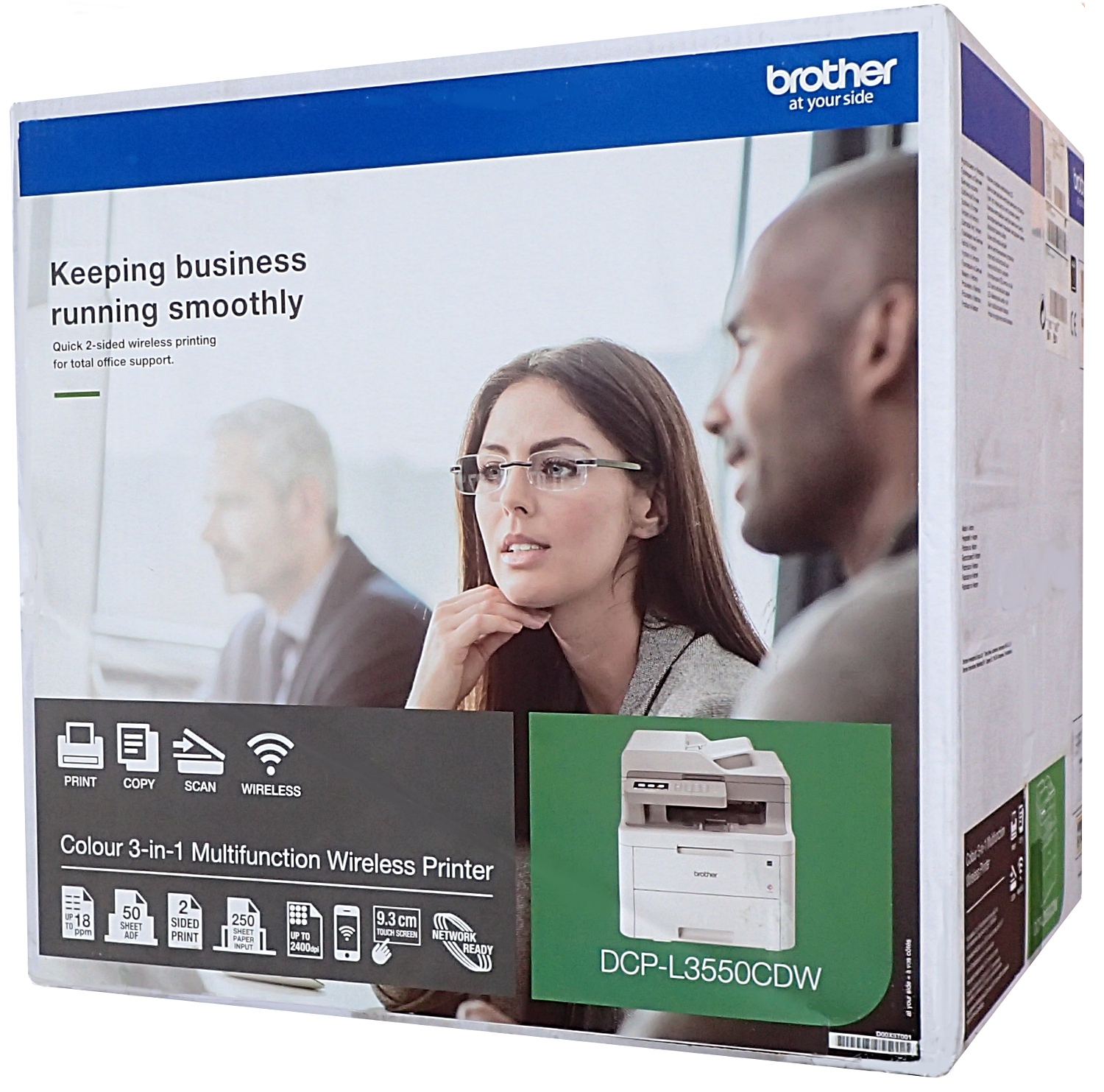 Brother DCP-L3550CDW – быстрое цветное многофункциональное устройство с двусторонней печатью (дуплекс ), который печатает, копирует и сканирует. Устройство печатает со скоростью 18 страниц в минуту в цветном и монохромном режиме, а также имеет возможность установки высокопроизводительных тонеров емкостью до 3000 страниц (черно-белый) и 2300 страниц (цветной). Устройство имеет соединения WiFi, Wi-Fi Direct, USB, LAN. Принтер оснащен цветным сенсорным дисплеем диагональю 9,3 см и устройством автоматической подачи документов.