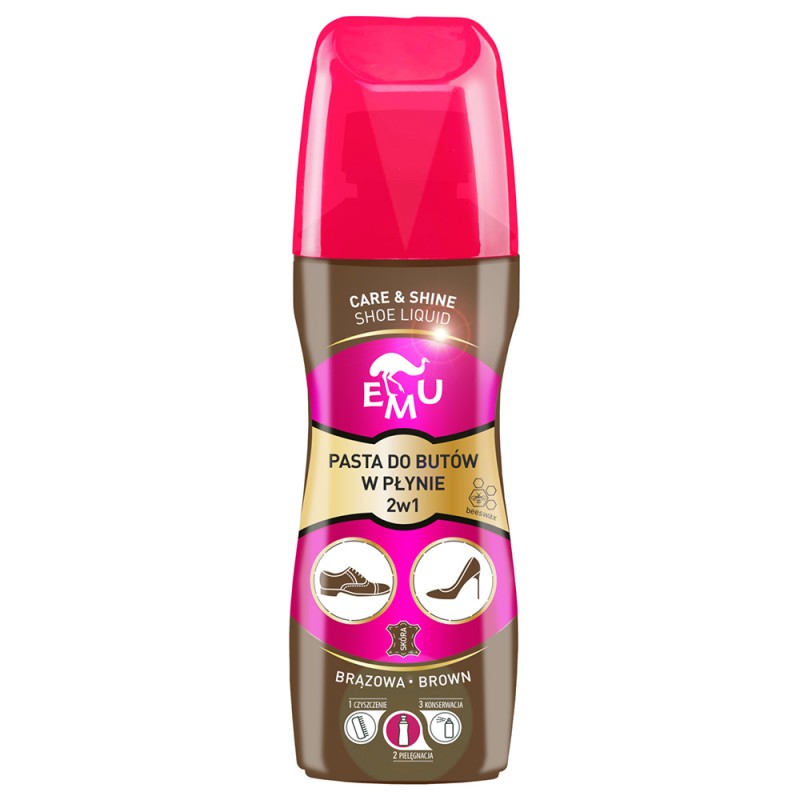 EMU коричневый жидкий крем для обуви для обуви из натуральной и экологической кожи. В его состав входит добавка пчелиного воска, который мгновенно придает обуви блеск без полировки.