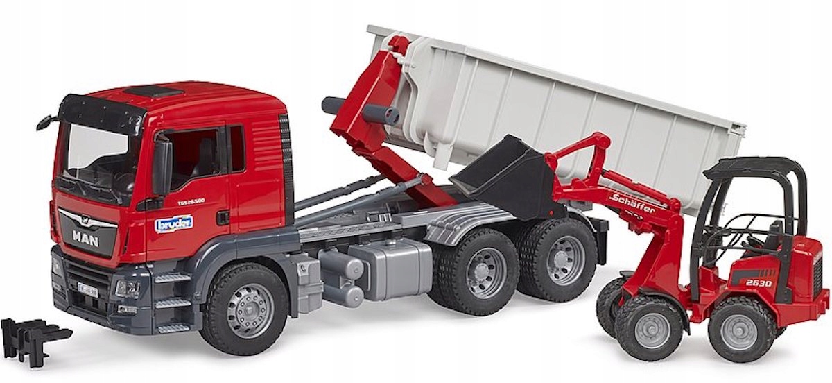 Двухцветная кабина водителя. имеет открывающиеся двери и предлагает каждому персонажу современного рабочего места в мире. Контейнер имеет две поворотные распашные двери на конце, и его можно опускать и поднимать назад с помощью захватного рычага. Если контейнер стоит на земле и дверь открыта, небольшие автомобили BRUDER могут даже въехать в контейнер и затем перевезти его контейнеровозом. Эта возможность также очень часто используется в реальной жизни на стройках, а маленькие строители могут имитировать эти гибкие возможности в детской комнате. В этот набор также входит всемирно известный сельскохозяйственный погрузчик Schäffer.