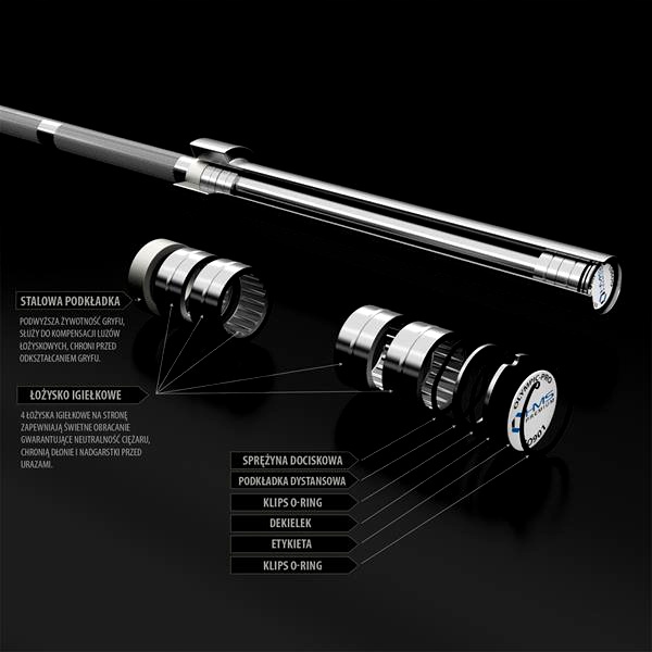 Олимпийская штанга GO900 HMS PREMIUM имеет 8 игольчатых подшипников (4 с одной стороны), которые обеспечивают плавное вращение деталей под нагрузкой. Его конструкция исключает нагрузку на концы роликов, что приводит к увеличению срока службы подшипников. Несмотря на небольшое поперечное сечение, игольчатые подшипники обладают высокой жесткостью и несущей способностью.