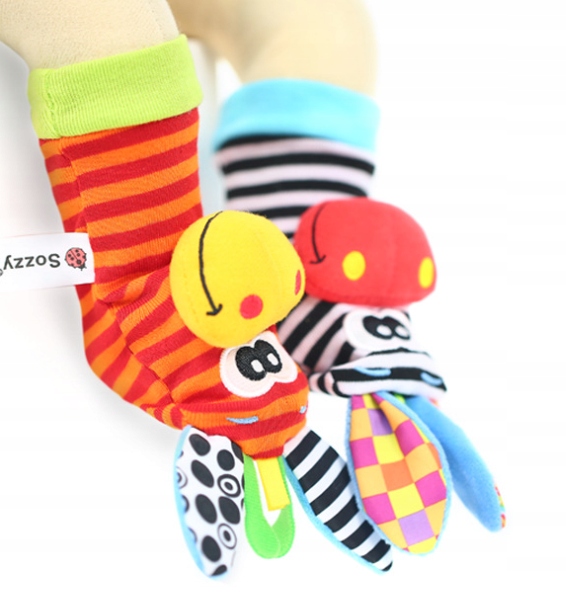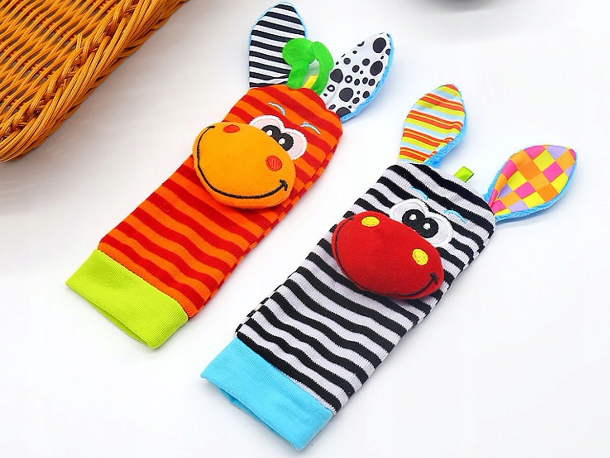 Повязки и носки с животными (4 шт.) содержат интерактивные элементы, которые добавляют игре увлекательности. В передней части повязки имеется пространственная погремушка, издающая нежный звук при движении руками ребенка. Во рту повязки слышна еще одна погремушка, а в ушах питомца шелест фольги, что добавляет дополнительных сенсорных раздражителей.