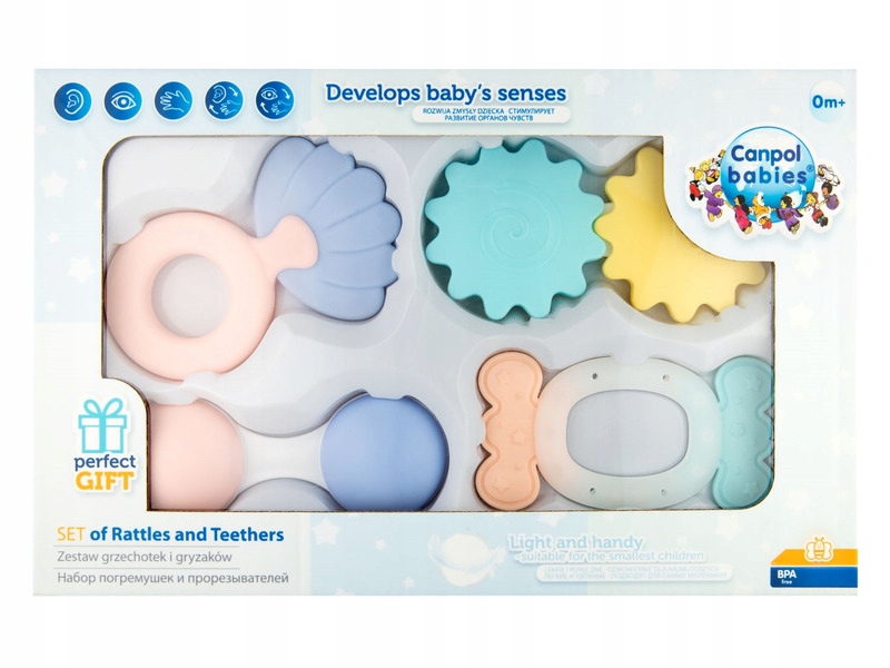Первый набор погремушек PASTEL — это четыре чрезвычайно легкие и удобные игрушки, идеально подходящие для маленьких ручек. Их разнообразные формы и пастельные цвета наверняка заинтересуют вашего ребенка и побудят его научиться хватать. Игрушки оснащены гибкими прорезывателями, облегчающими прорезывание зубов, а также привлекательными вращающимися элементами и погремушками, которые побуждают к игре. Набор отлично подойдет в качестве первого подарка любому малышу!